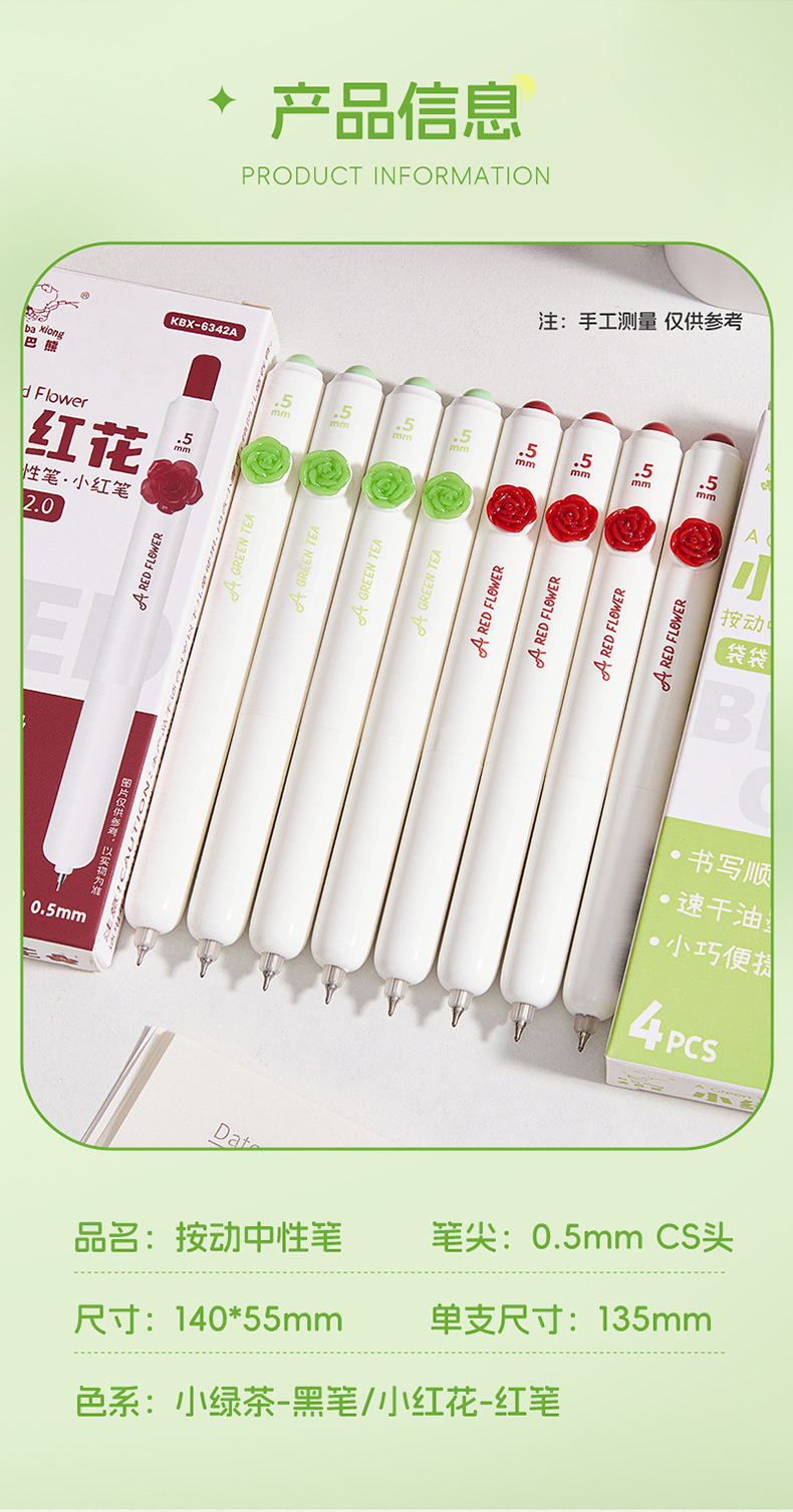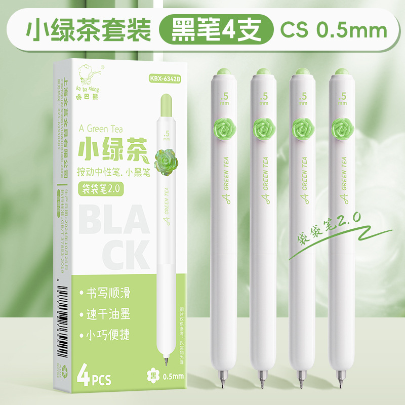 外壳材质: 塑料 品牌: 咔巴熊 笔尖材质: 不锈钢 是否可擦: 否 系列: 办公笔 货号: KBX-6342 笔芯颜色: 小绿茶 笔头: 0.5mm 包装形式: 盒装 笔头类型: CS头 适用场景: 通用 闭合方式: 按动 包装种类: 基础包装 适用人群: 通用 重量: 0.5 kg/盒