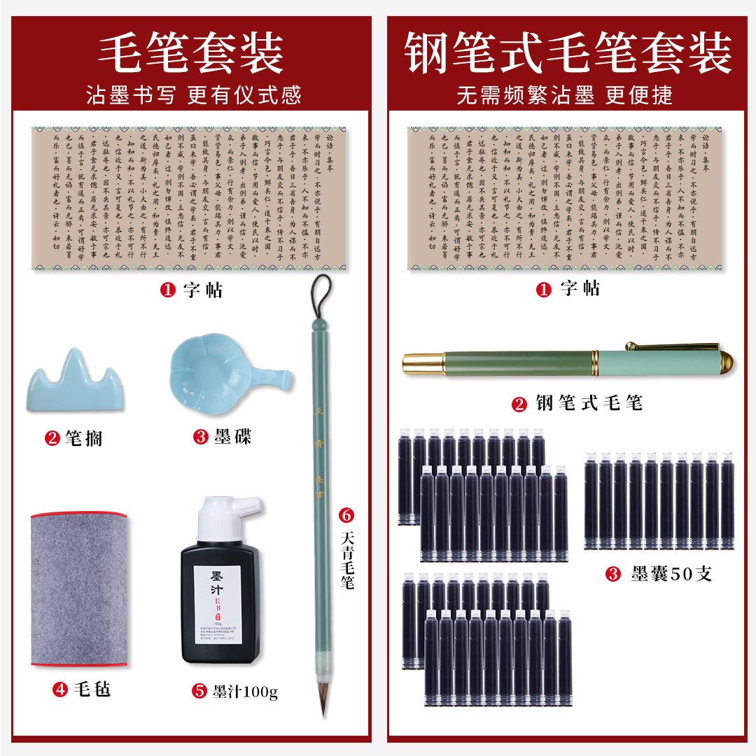 | 毛笔套装(字帖+笔搁+墨碟+墨汁+毛笔+毛毡) | ¥2113 | 196件可售 |