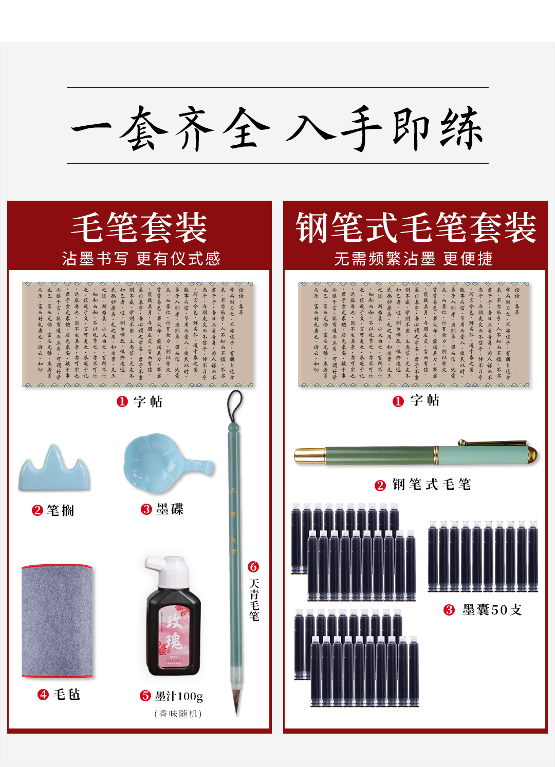 | 钢笔式毛笔套装(字帖+钢笔式毛笔+墨囊30支) | ¥1863 | 185件可售 |