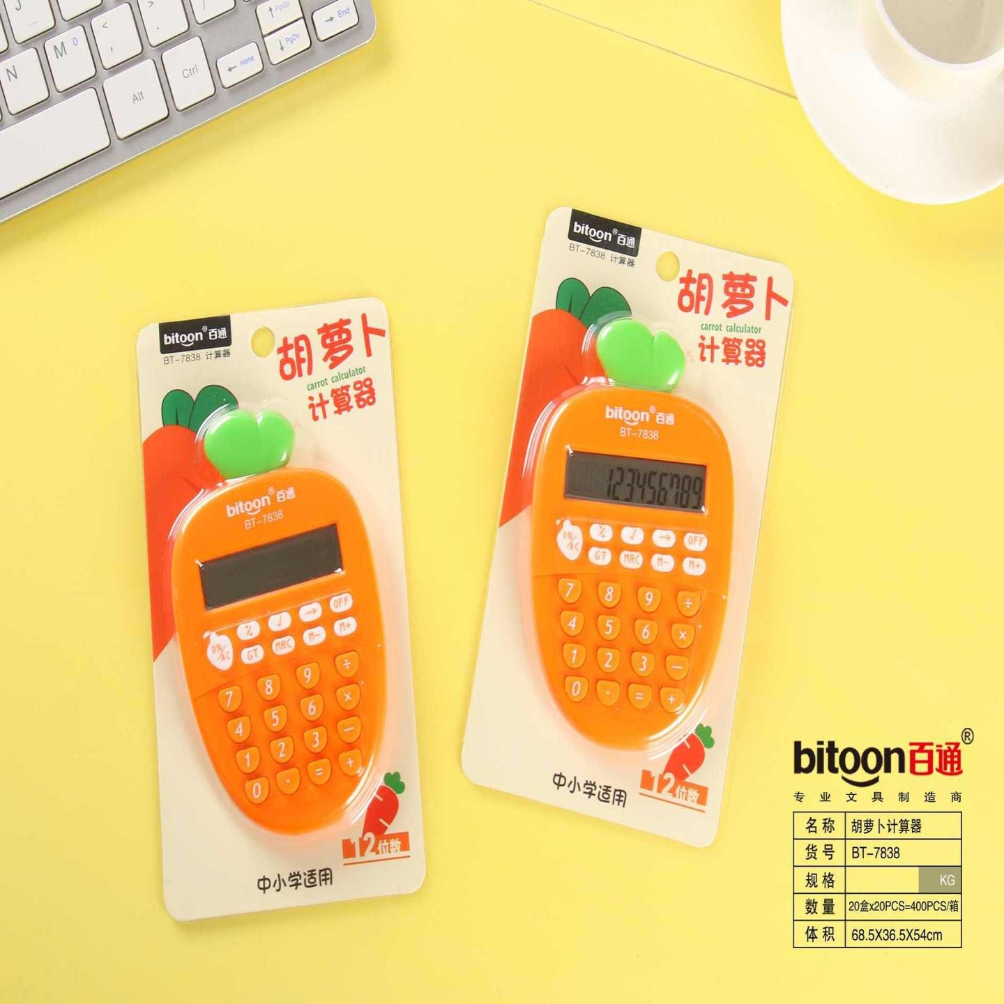 品牌: 百通 产品类型: 算数计算器 是否带电池: 否 材质: 塑料 是否带语音功能: 否 适配电池: 普通干电池 货号: 7838-萝卜计算器 型号: BT-7838 规格: 一台(不含电池) 加印LOGO: 可以 加工定制: 是 显示位数: 12 净重: 70G 是否进口: 否 是否跨境出口专供货源: 否 是否属于礼品: 是,个人礼品 重量: 0.177 kg/个