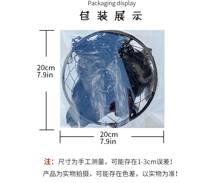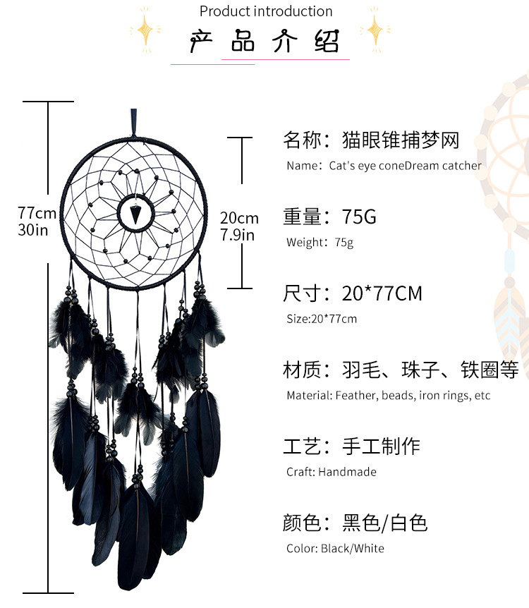 材质: 铁圈+羽毛 尺寸: 20cm*77cm 品牌: 梦萤 工艺: 手工编织 风格: 欧式 货号: BMW2417 产地: 浙江义乌 是否进口: 否 产品编号: BMW2417 颜色: 猫眼锥-黑色,猫眼锥-白色 包装: OPP袋 是否专利货源: 否 规格: 成品 有可授权的自有品牌: 是 是否跨境出口专供货源: 是 是否属于礼品: 是,个人礼品 是否IP授权: 否 重量: 0.5 kg/个