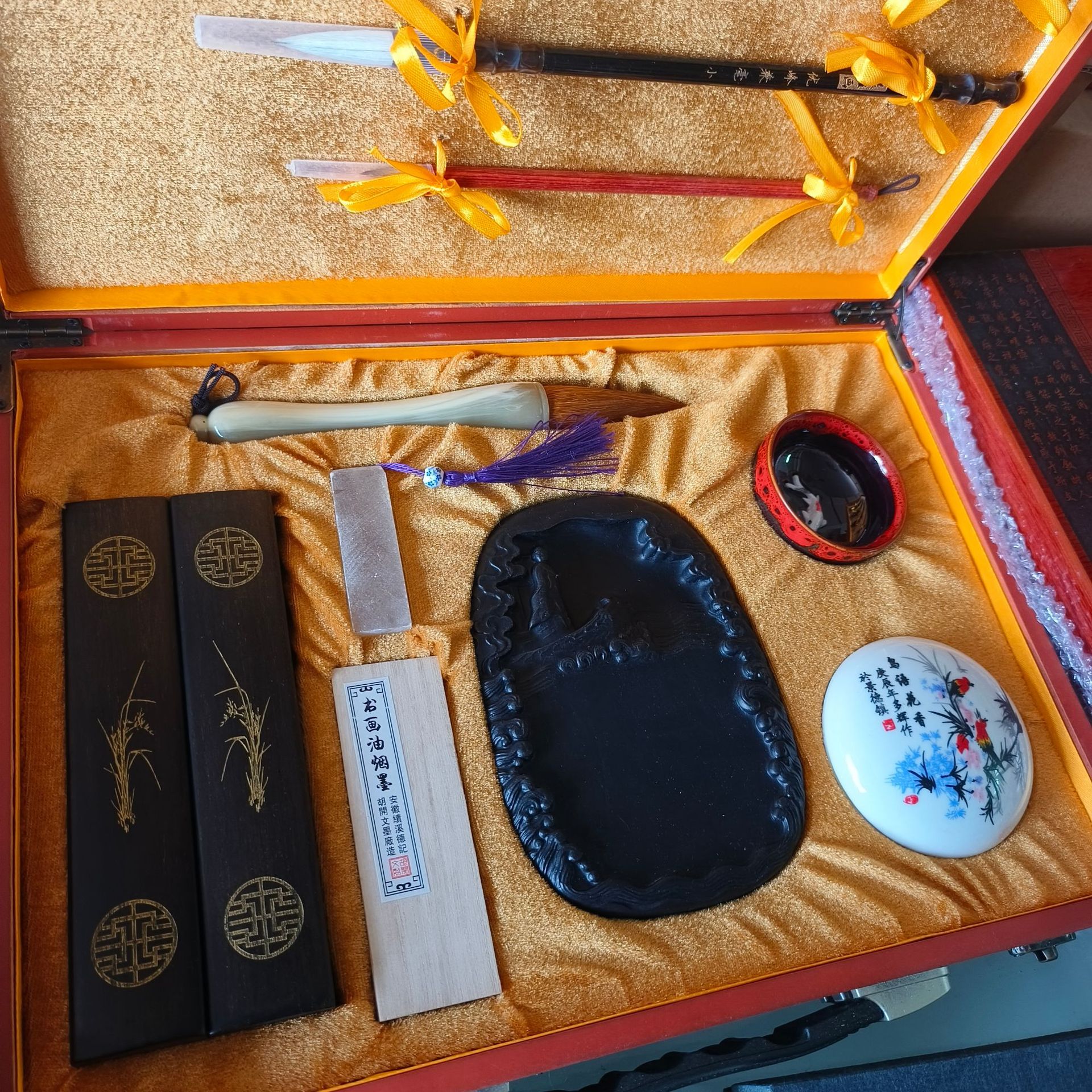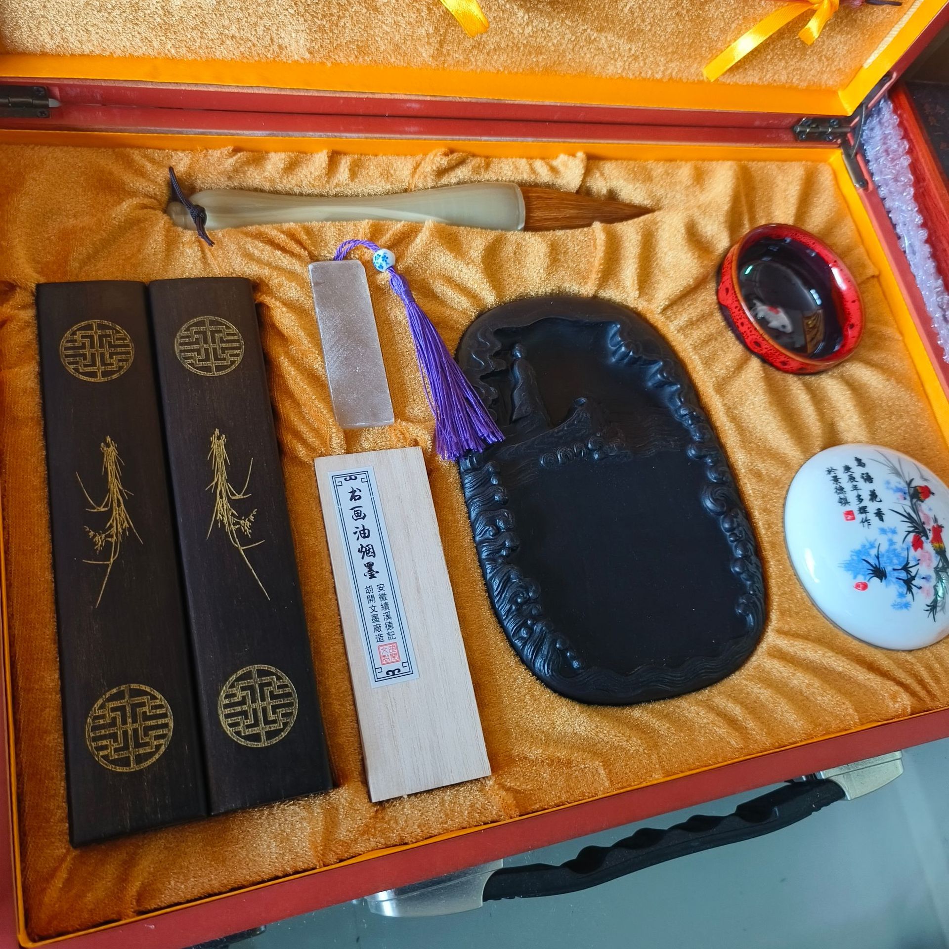 材质: 木盒 品牌: 弘扬 货号: 380 产品类别: 文房四宝套件 产地: 江西 是否进口: 否 规格: 高档文房四宝礼盒套装 是否跨境出口专供货源: 否 是否属于礼品: 是,商务礼品 是否IP授权: 否 重量: 0.366 kg/套