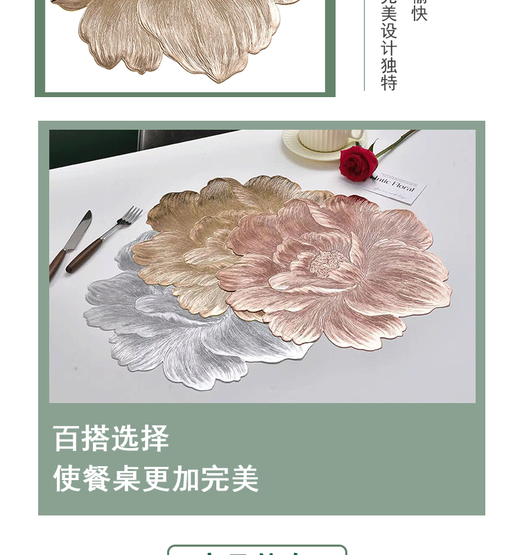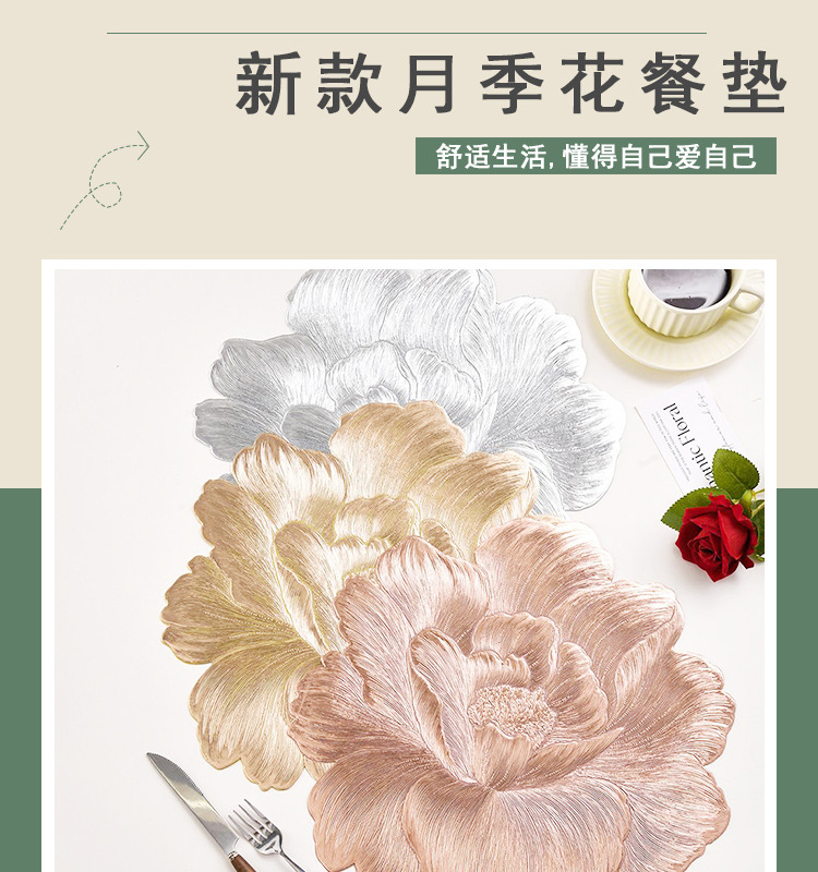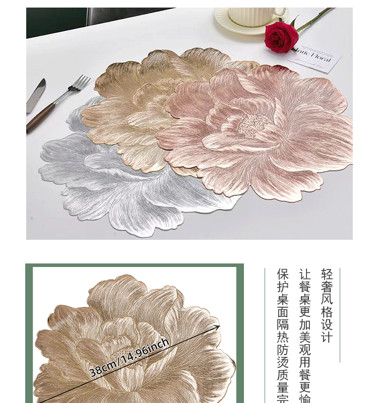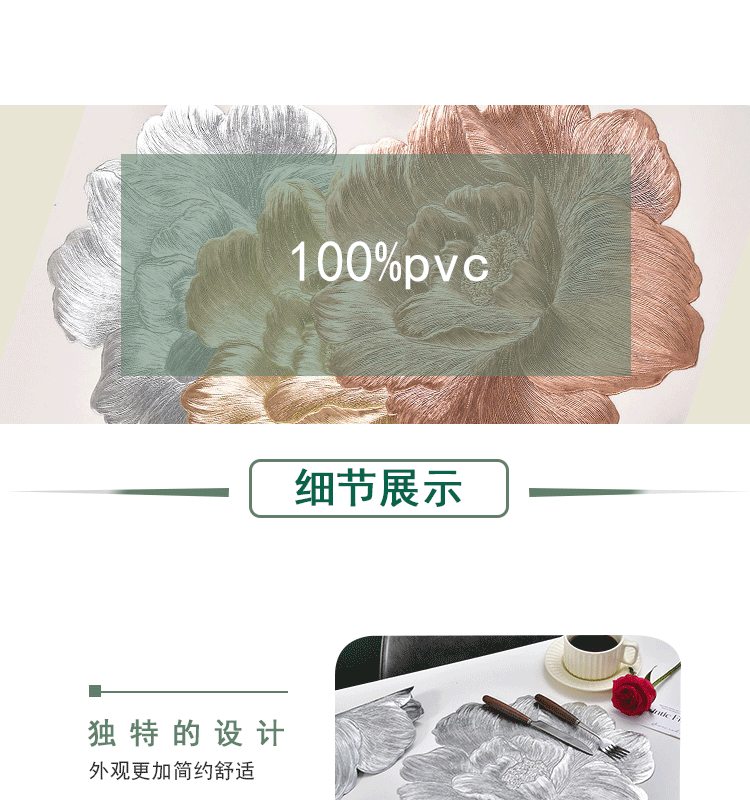 材质: PVC 品牌: 若惜佳 风格: 欧美风 形状: 不规则形 是否支持订制: 否 面料主成分: PVC 面料主成分含量: 100 面料次成分: PVC 面料次成分含量: 0 货号: rxj 颜色: 金色-月季花,银色-月季花,玫瑰金-月季 规格: 38cm 主要下游平台: 亚马逊,wish,速卖通 主要销售地区: 中东,其他 有可授权的自有品牌: 否 是否跨境出口专供货源: 是 空间: 书房,室外,餐厅,浴室,阳台,商用场所, 是否有版权或专利: 否 重量: 0.5 kg/个