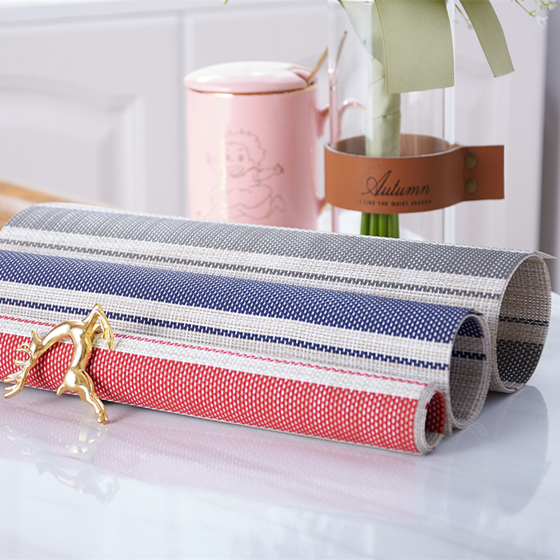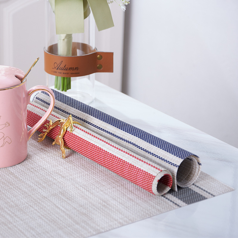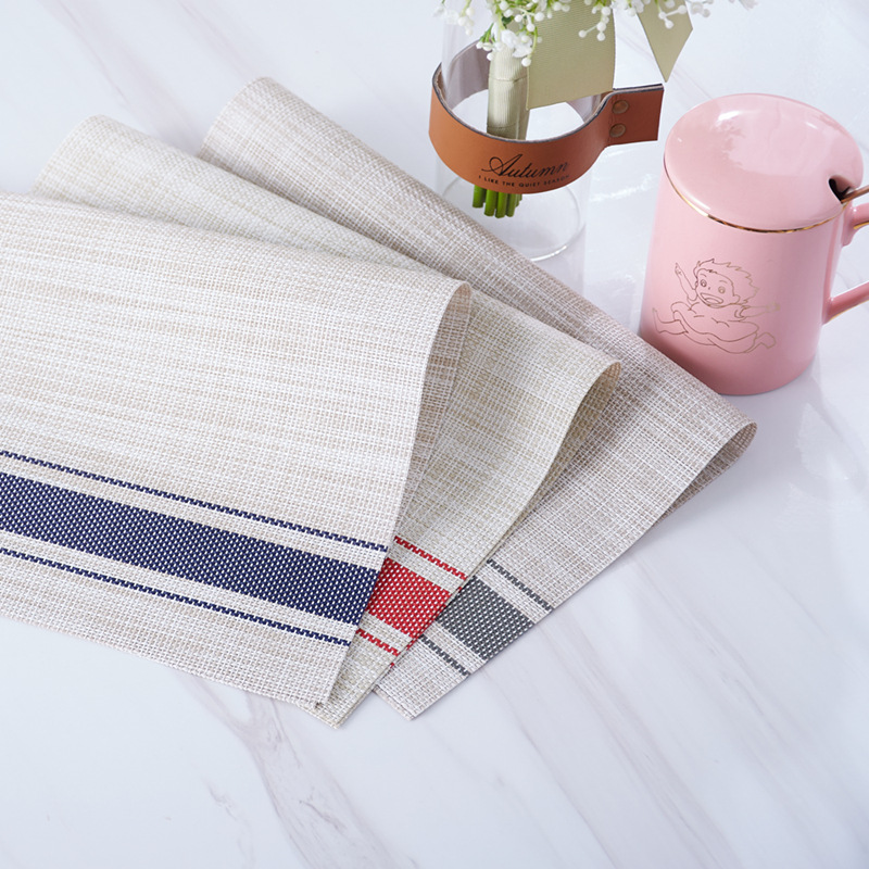 给餐桌一张餐垫,立刻让你有种焕然一新的感觉,质感突出自然美丽,展现条纹间质感防滑PVC易清洗,裁剪无毛边,保护桌面不损坏,正反都能用,不散边,不掉色。