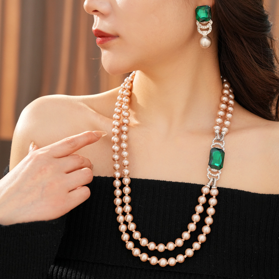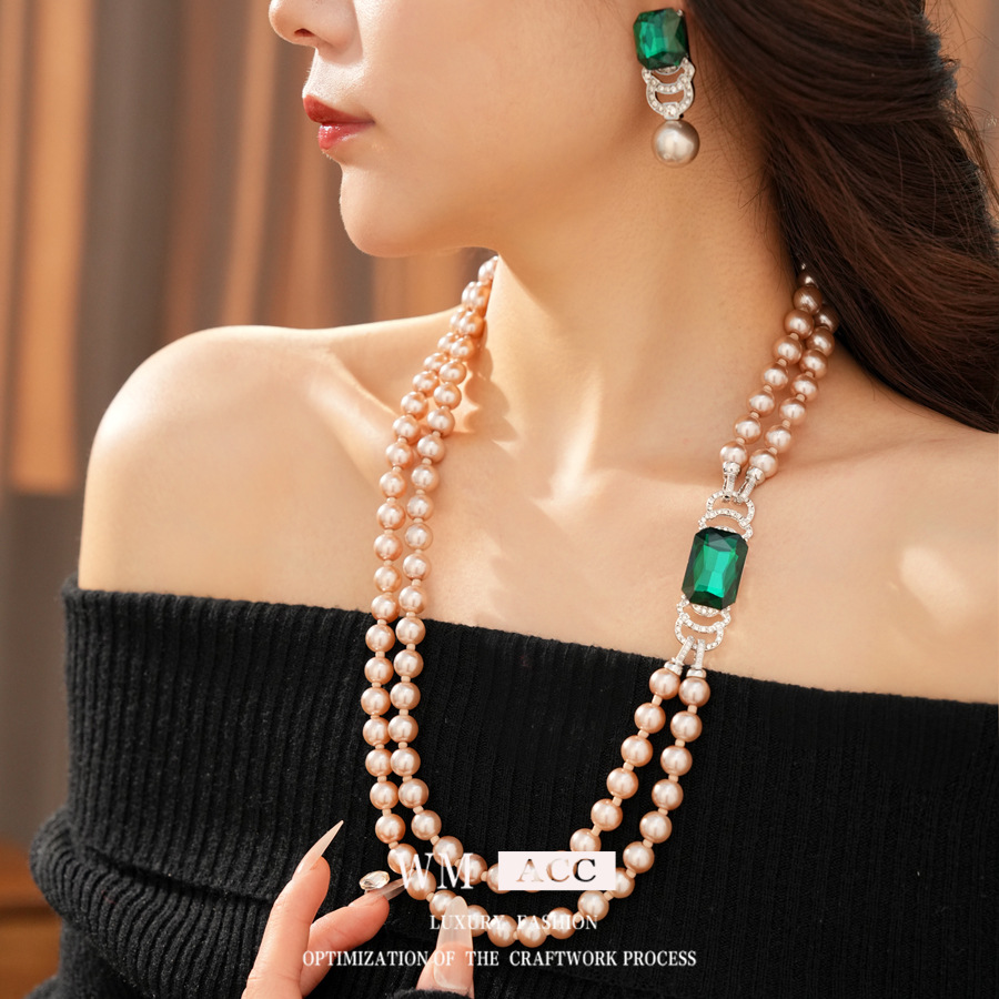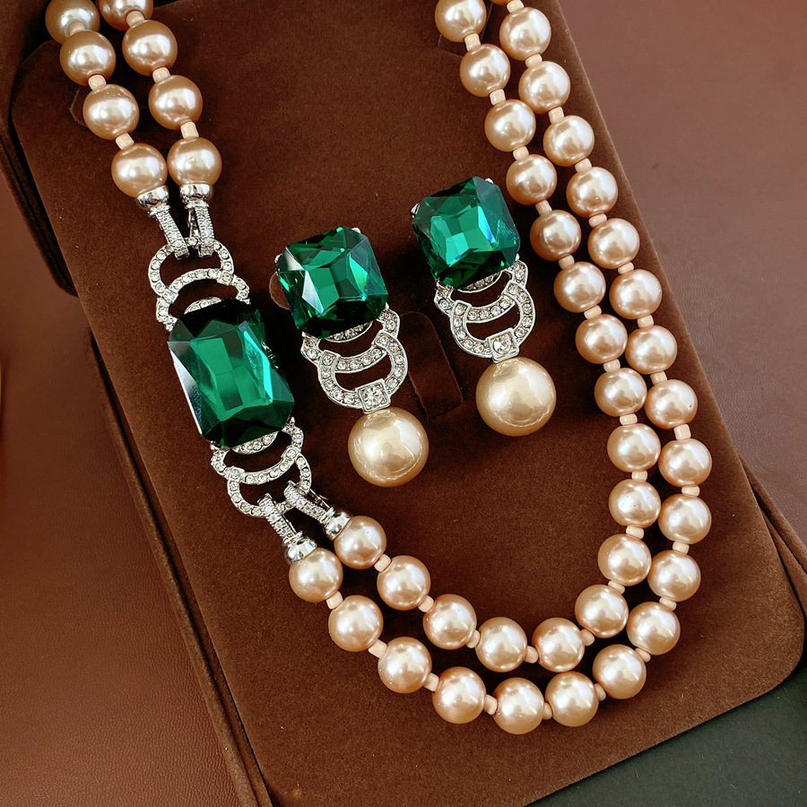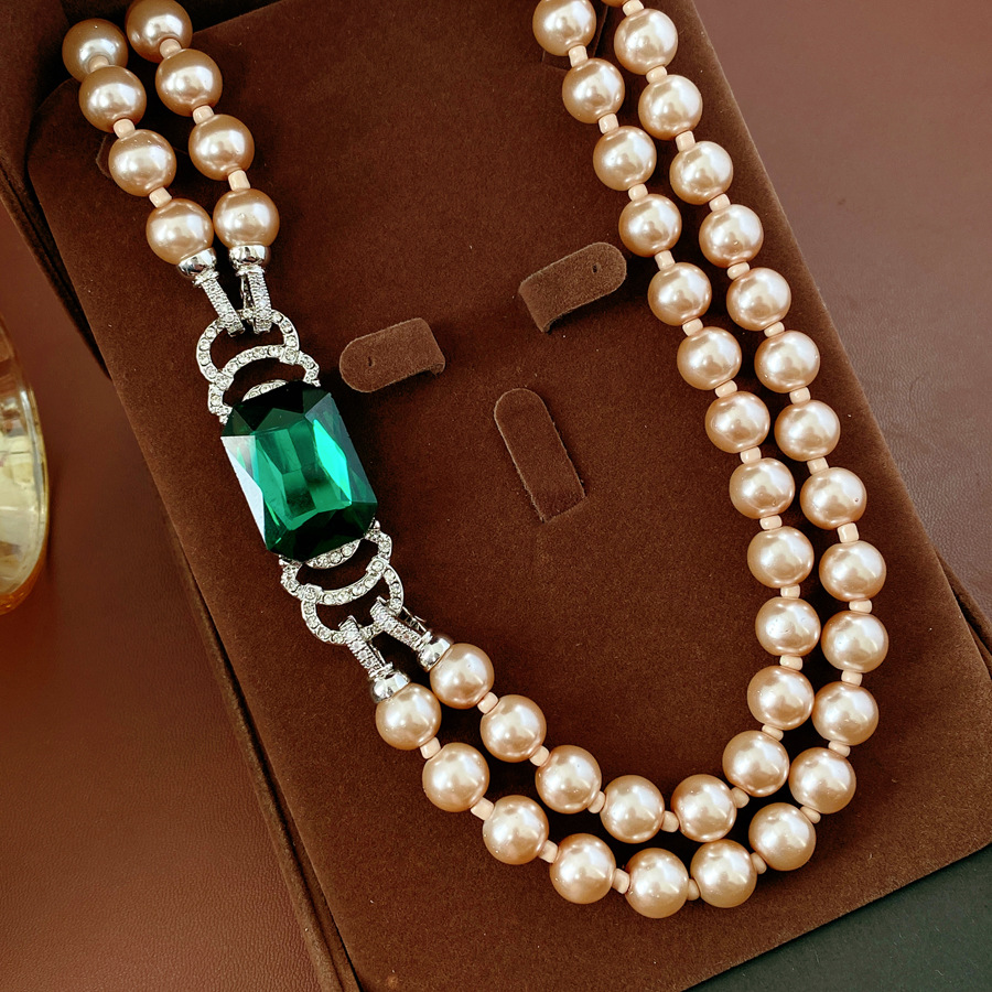 中古vintage镶钻方形双层串珠珍珠项链轻奢小众锁骨链首饰套装女 English | 投诉