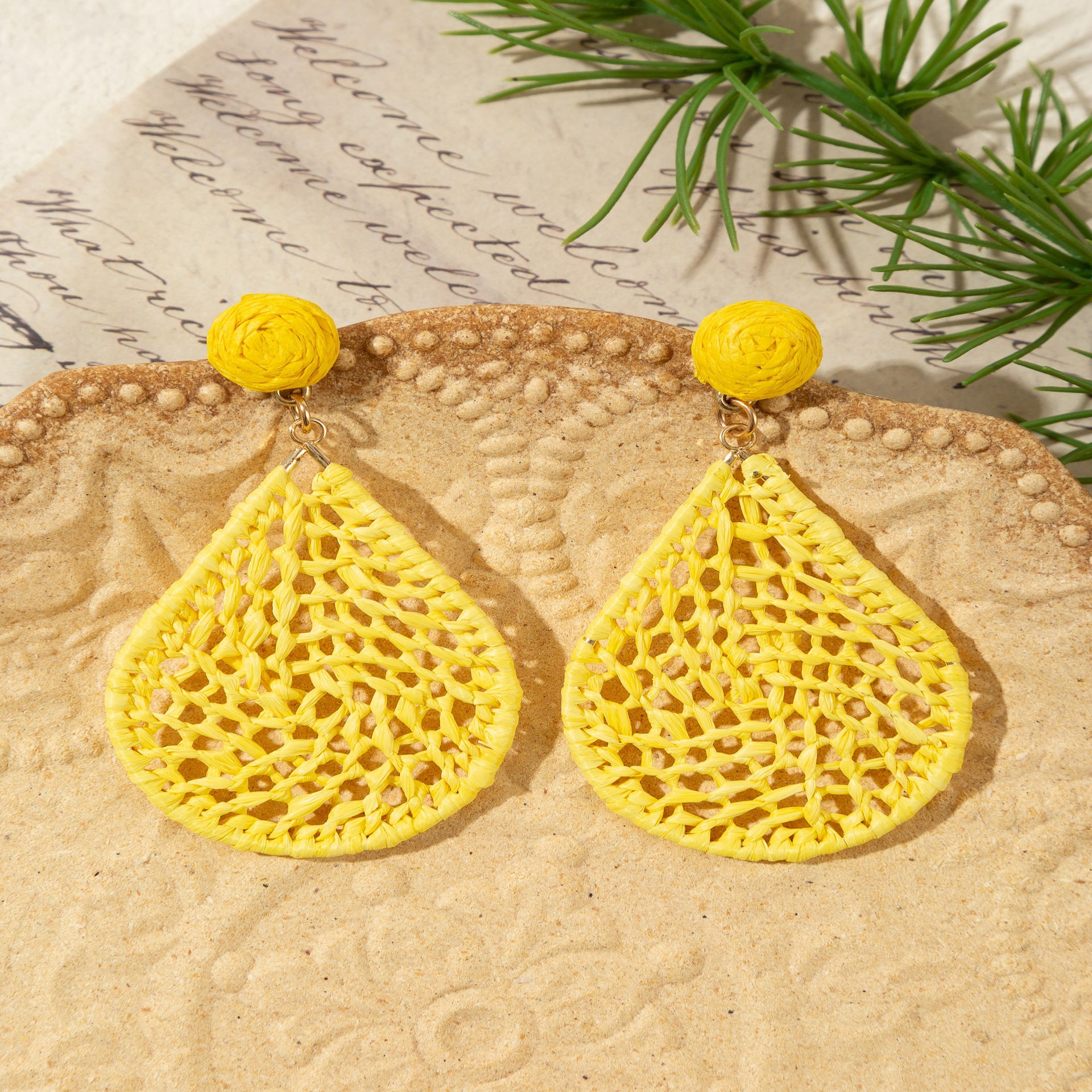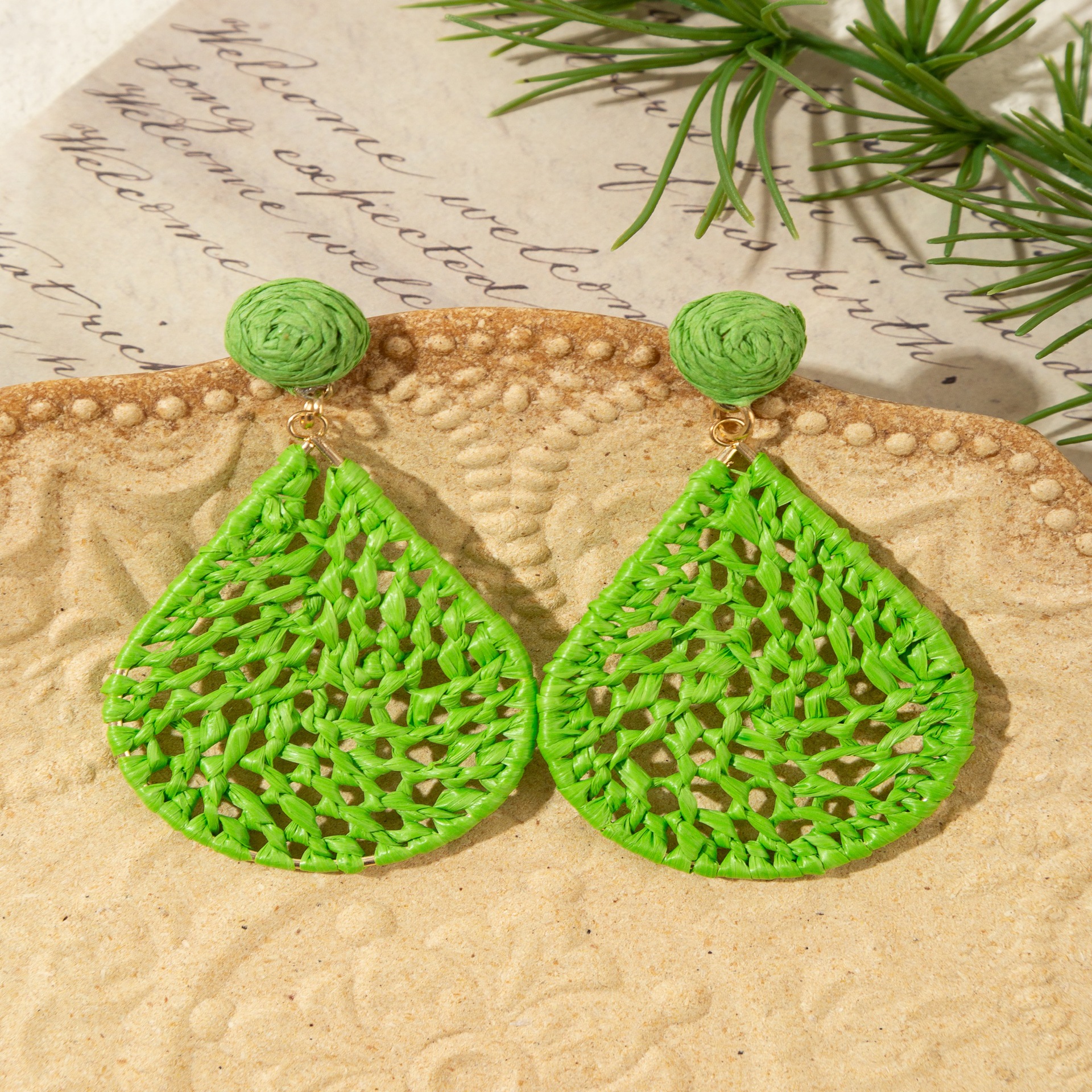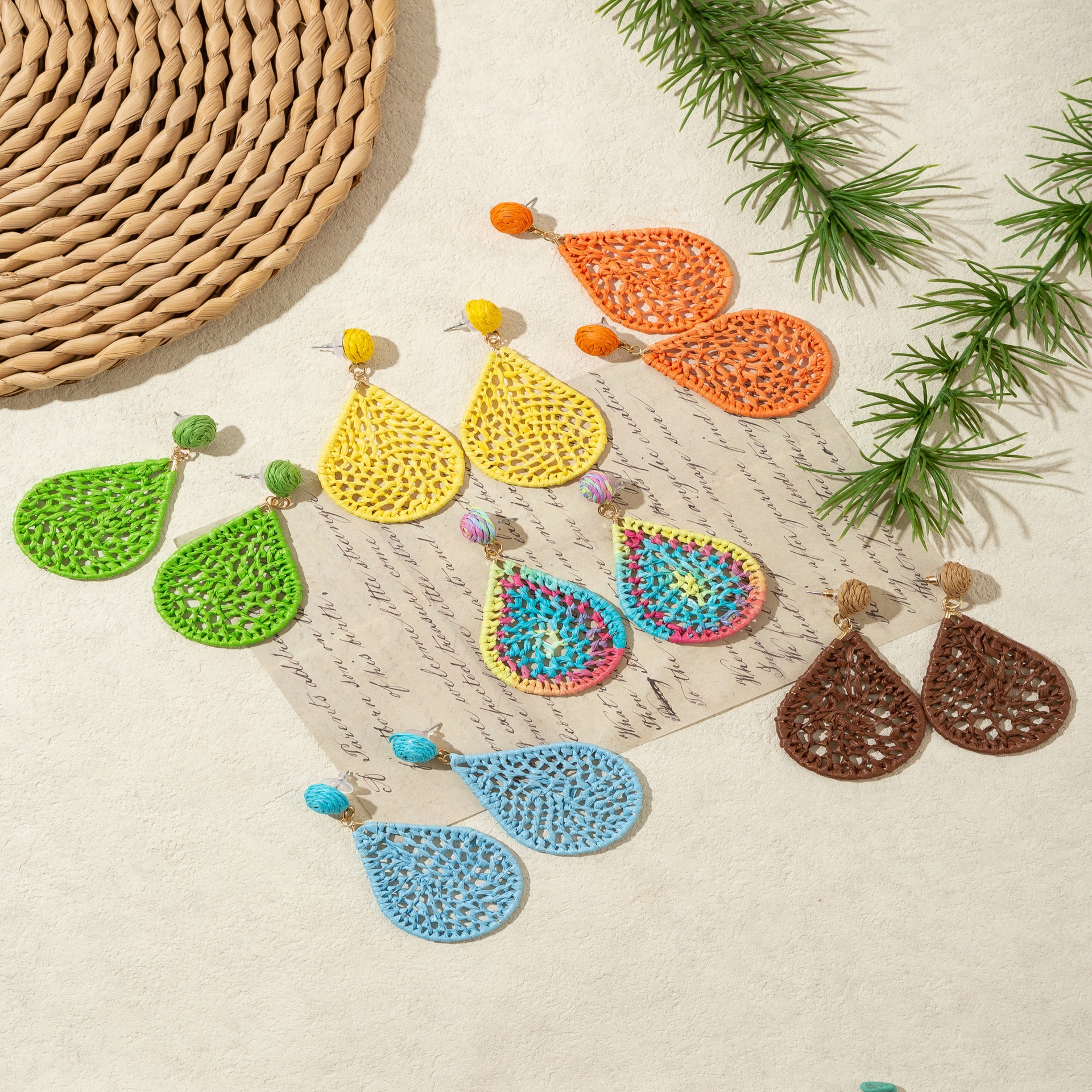 材质: 拉菲草 处理工艺: 手工编织 品牌: 悠格 流行元素: 水滴 风格: 度假风 货号: E090 造型: 花卉 产地: 义乌 主要下游平台: 淘宝,京东,ebay,亚马逊,wish, 颜色: 绿色,黄色,天蓝色,花色,咖啡色,桔色 纯度: 925银 有可授权的自有品牌: 否 是否跨境出口专供货源: 是 上市年份/季节: 2025年秋季 耳针材质: 925银 风格分类: 清新甜美 主要销售地区: 非洲,欧洲,南美,东南亚,北美,中东,其 适用人群: 女式 流行元素分类: 自然 重量: 0.015 kg/包