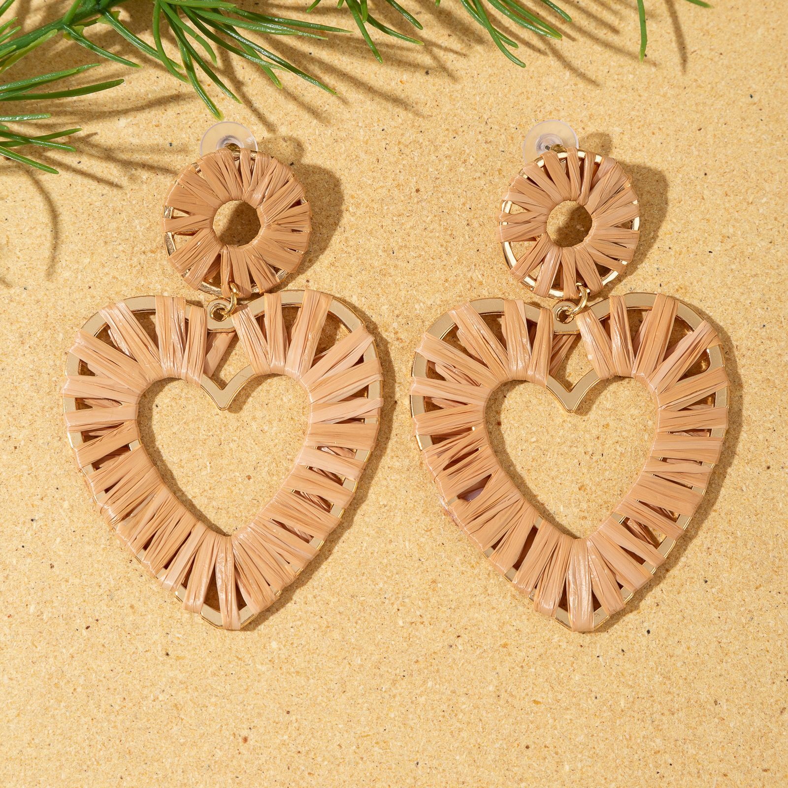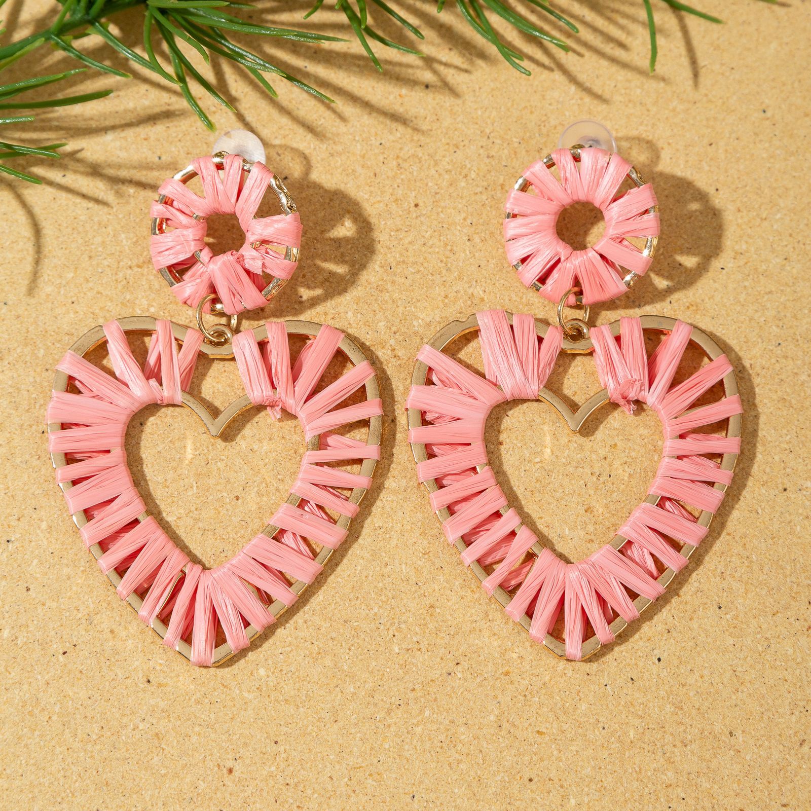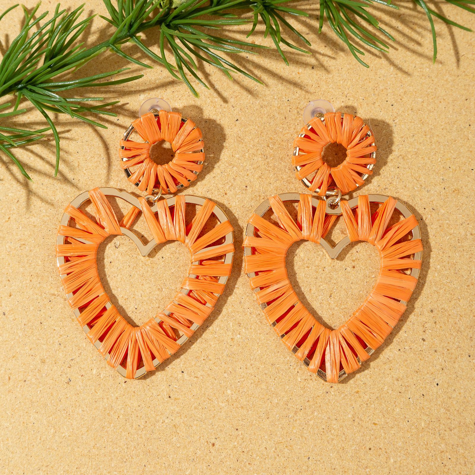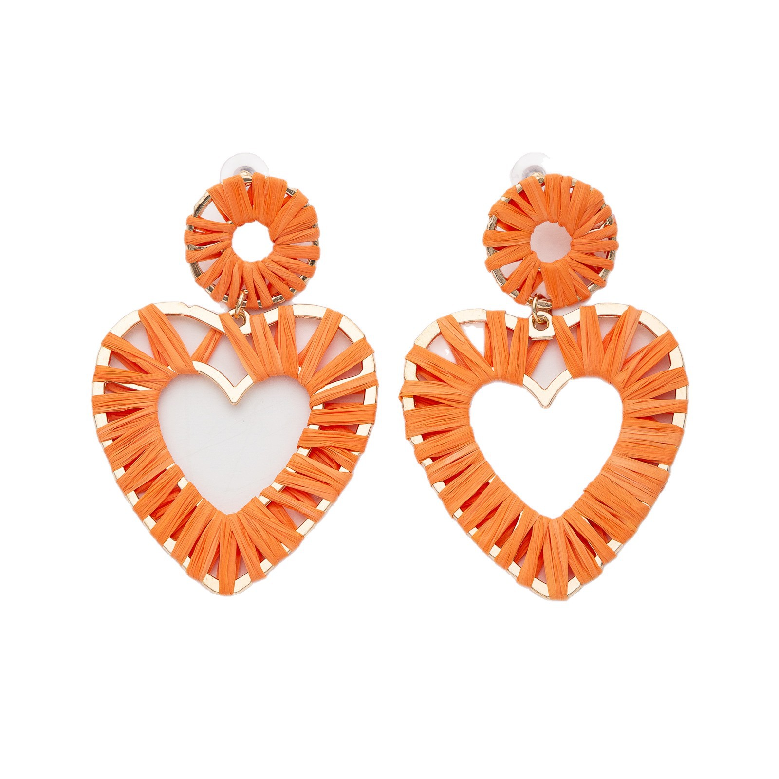 欧美时尚手工编织拉菲草桃心耳环海边度假风耳钉小众设计女士耳饰 English | 投诉