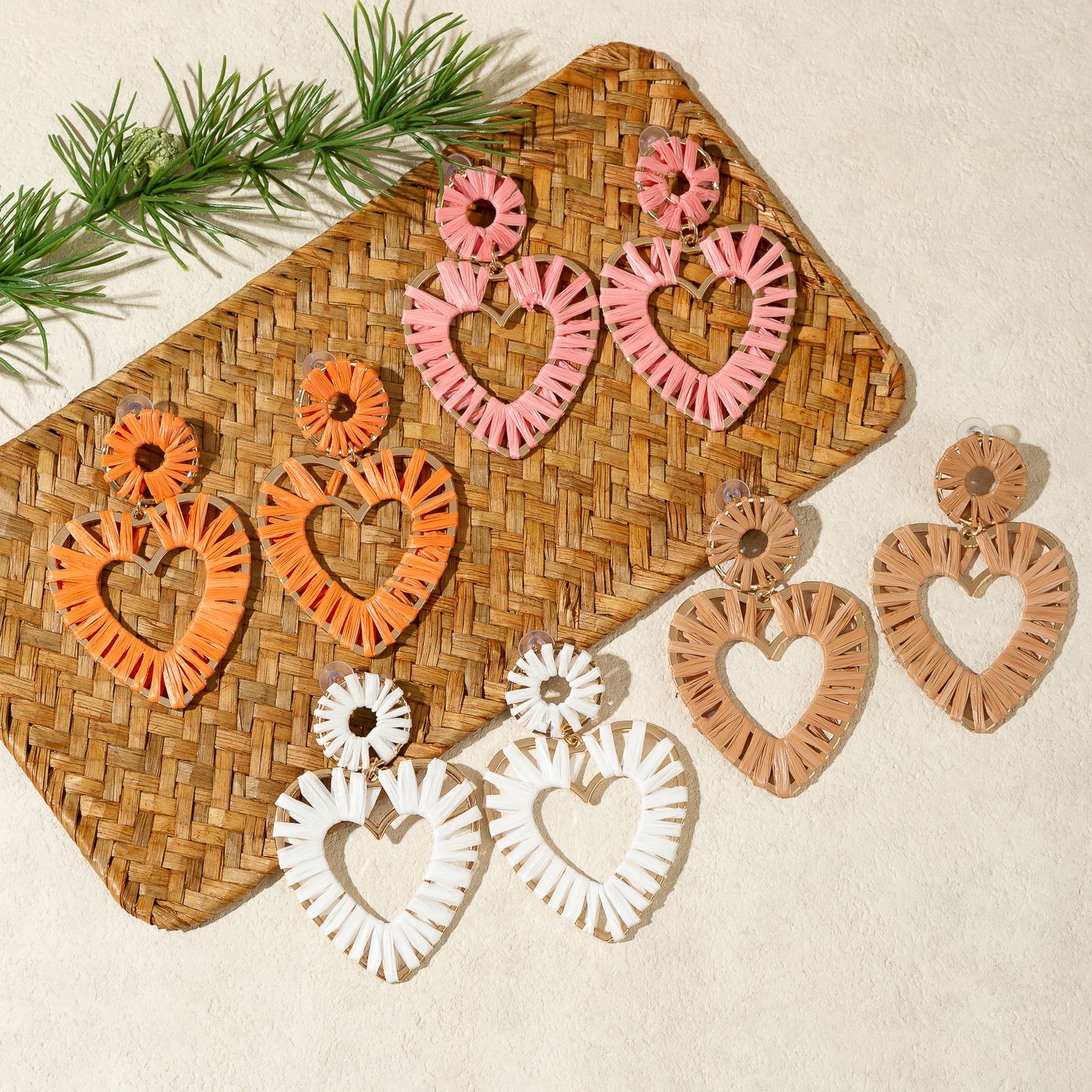 材质: 拉菲草 处理工艺: 手工编织 品牌: 悠格 流行元素: 爱心/心形 风格: 度假风 货号: E0908 造型: 心形 产地: 义乌 主要下游平台: 淘宝,京东,ebay,亚马逊,wish, 颜色: 混彩,黄色,玫红色,粉红色,白色,咖啡色 是否跨境出口专供货源: 是 上市年份/季节: 2025年秋季 耳针材质: 不锈钢 风格分类: 时尚通勤 主要销售地区: 非洲,欧洲,南美,东南亚,北美,中东,其 适用人群: 女式 流行元素分类: 形状/图案 重量: 0.025 kg/包