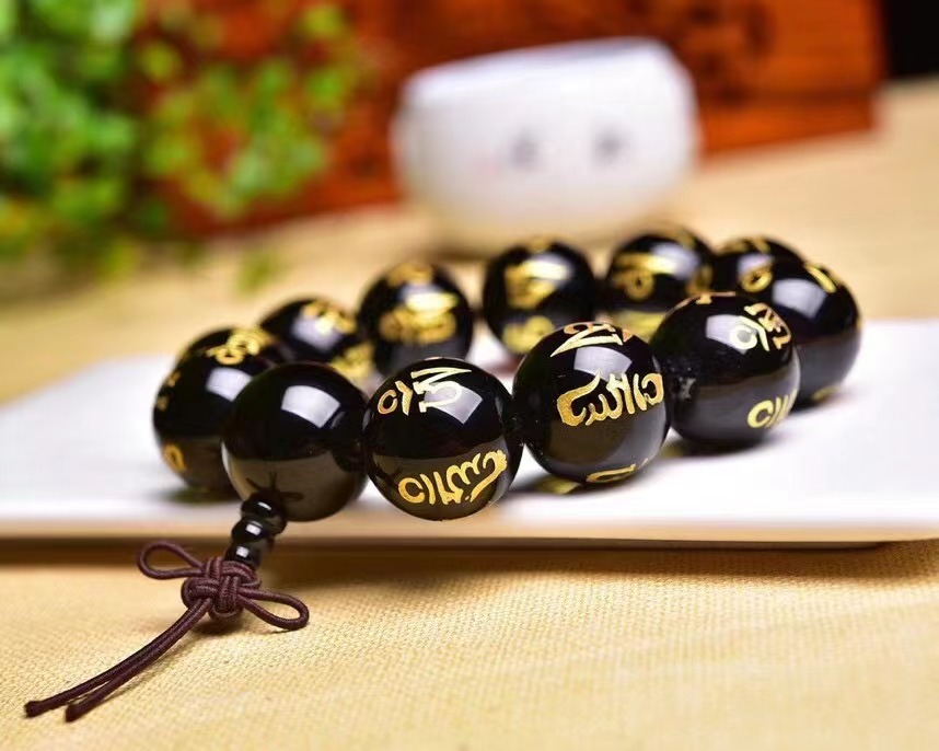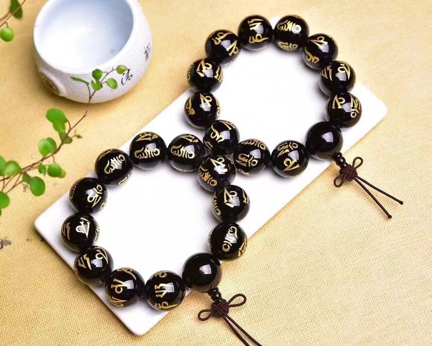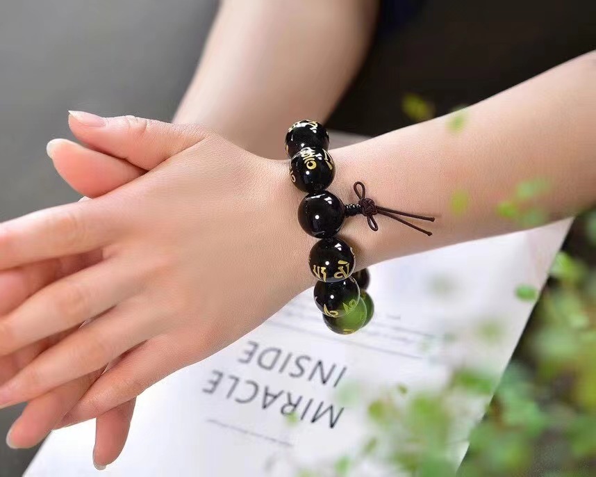 黑玛瑙金色六字真言佛头手链 尺寸20mm晶体圆润 简单大方 男款 English | 投诉