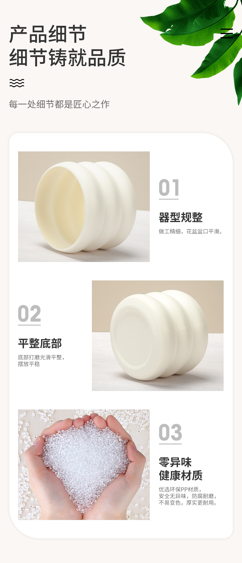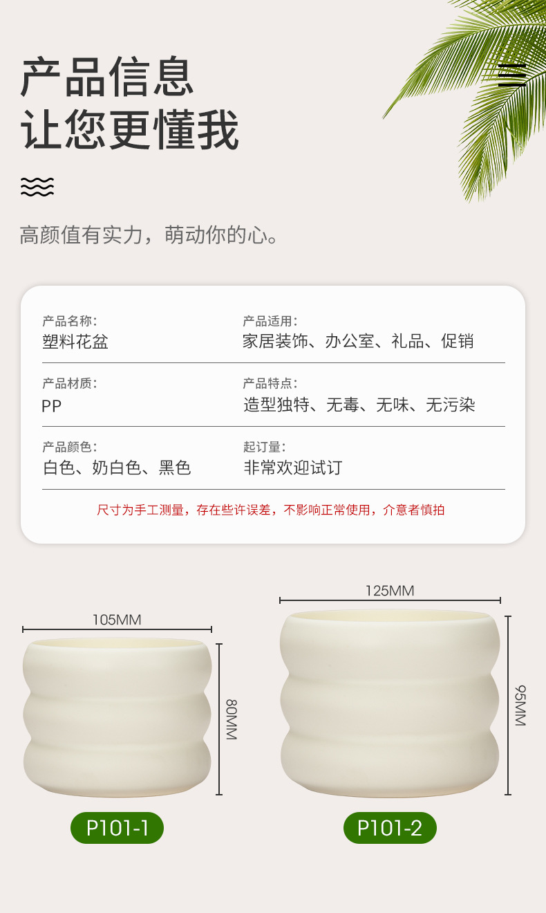 材质: 塑料 工艺: 注塑 是否进口: 否 品牌: 义彩 尺寸: L10.5*H8.0 CM 奶白色,L1 货号: P101 【空盆无孔、可打孔】 是否跨境出口专供货源: 否 是否属于礼品: 否