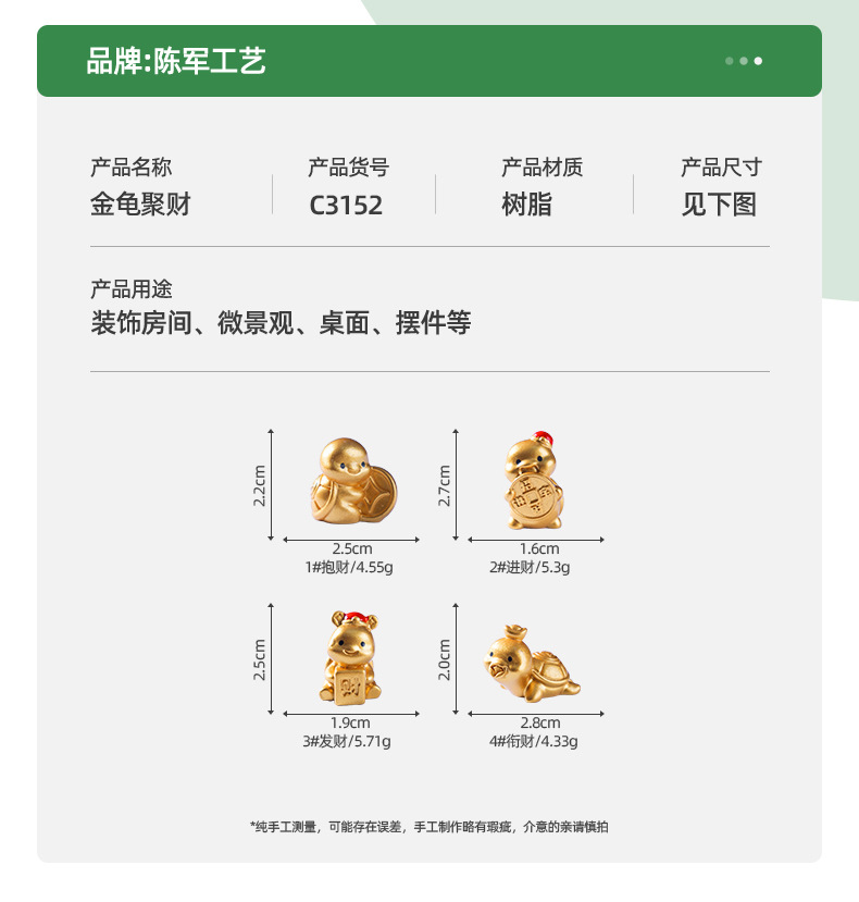 材质: 树脂 类别: 树脂工艺品 风格: 卡通 品牌: 陈军工艺 包装: 普通包装 货号: C3152 是否专利货源: 否 颜色: 1#抱财,2#进财,3#发财,4#衔财 尺寸: 金龟聚财 是否属于礼品: 否