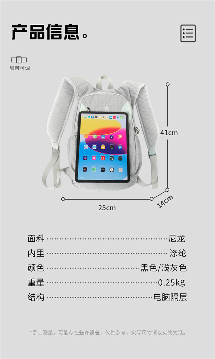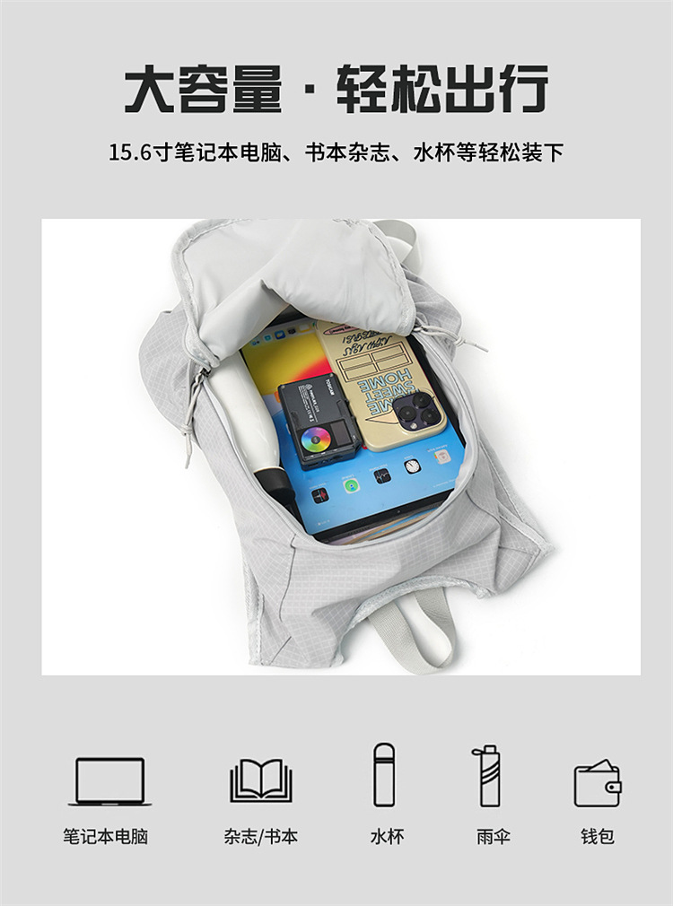 材质: 尼龙 功能: 可收纳 里料质地: 尼龙 皮质特征: 其它 容纳电脑尺寸: 16英寸 容量: 20-35L 适用性别: 中性/男女均可 品牌: 其他 颜色: 黑色,浅灰色 适用场景: 休闲旅行 风格: 无性别风 上市年份季节: 2025年秋季 货号: WTA623 图案: 纯色 流行元素: 刺绣 背负系统: 弧形肩带 有可授权的自有品牌: 否 重量: 0.203 kg/个