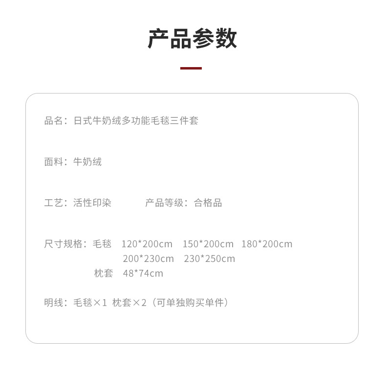 | 盖毯三件套-【180x200cm盖毯+枕套一对】 | ¥7500 | 999999件可售 |