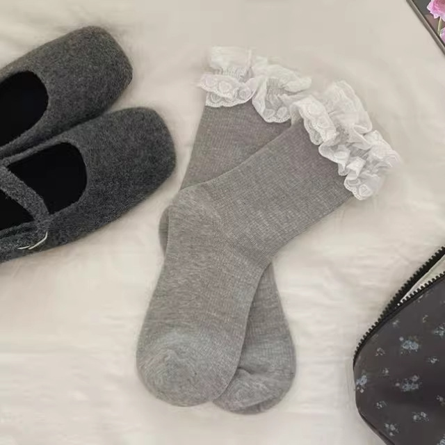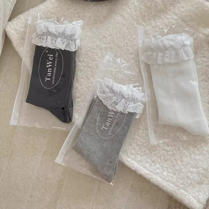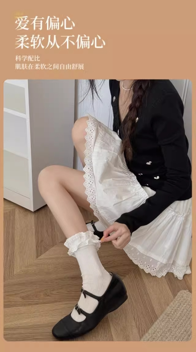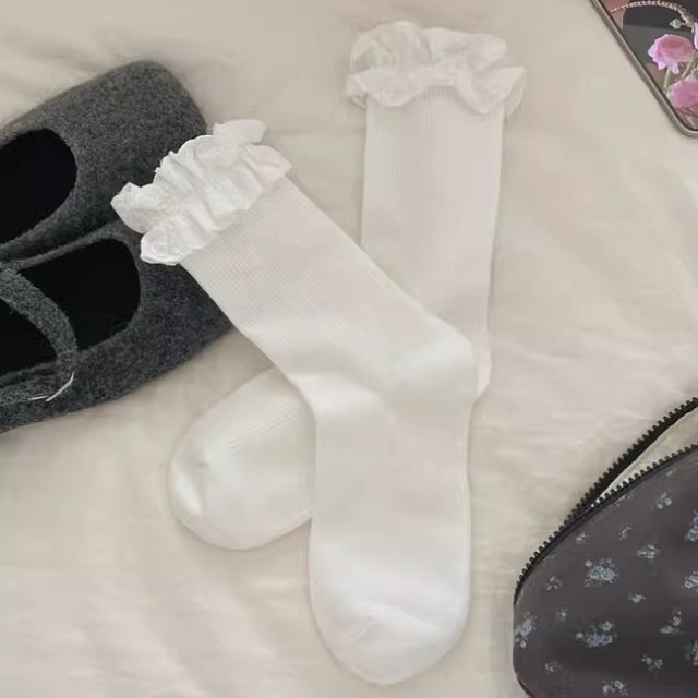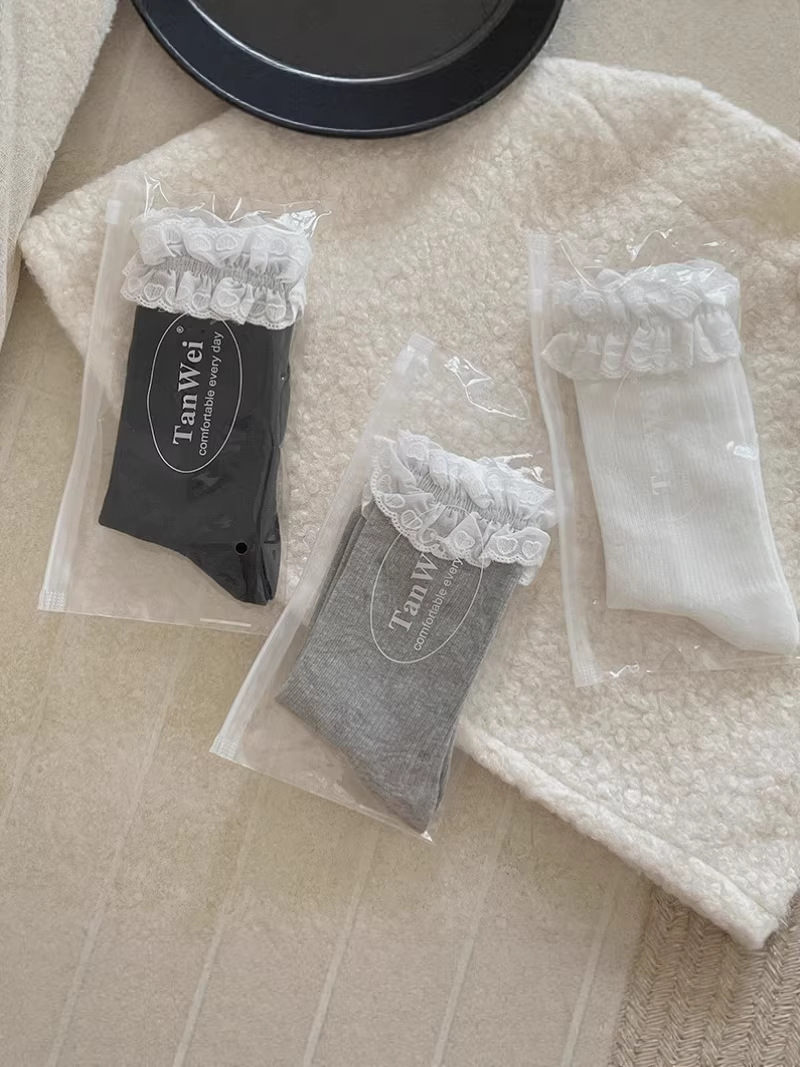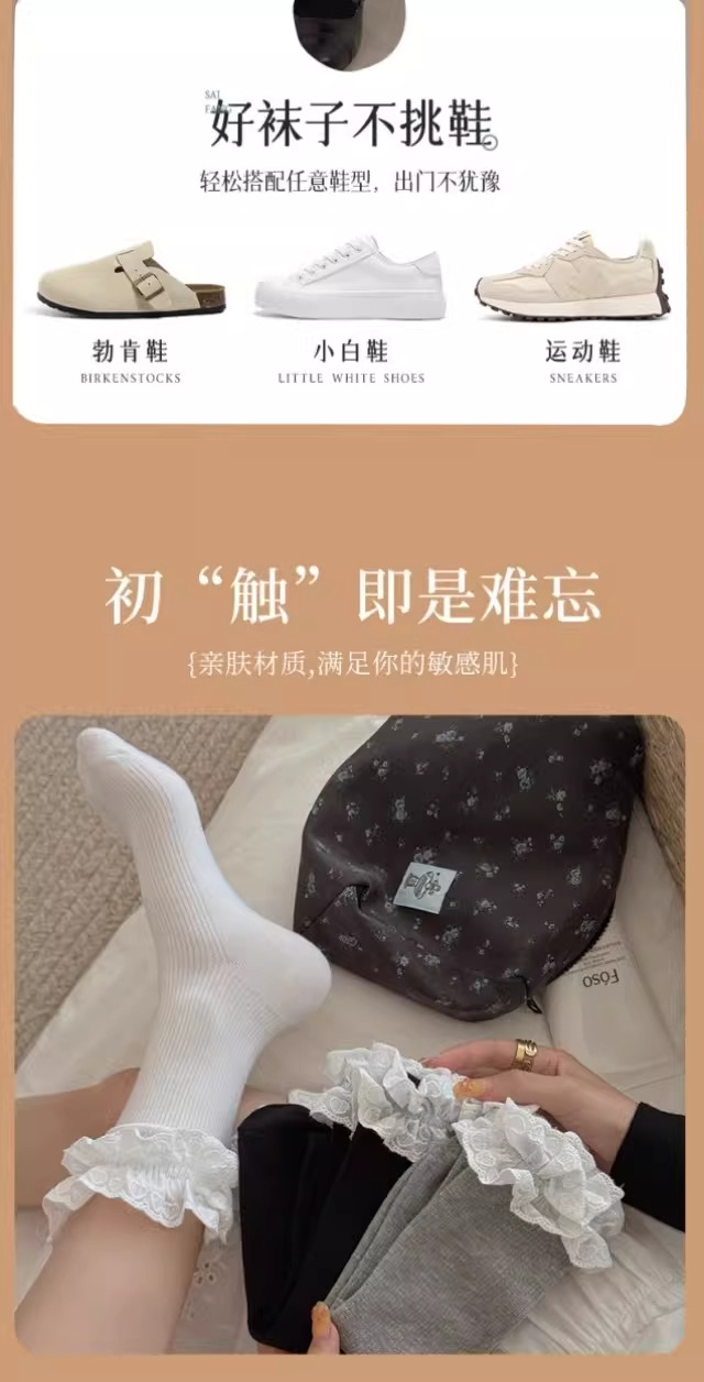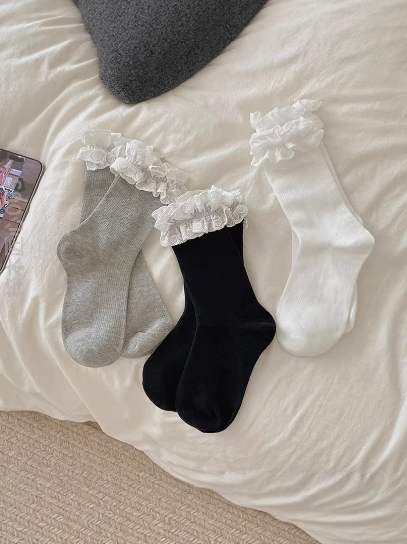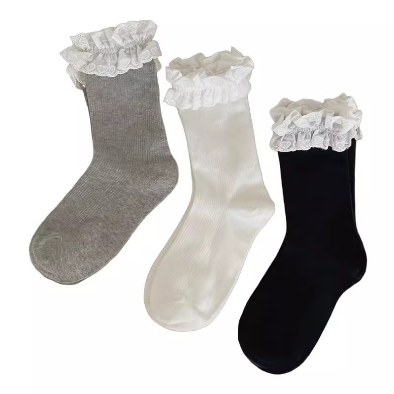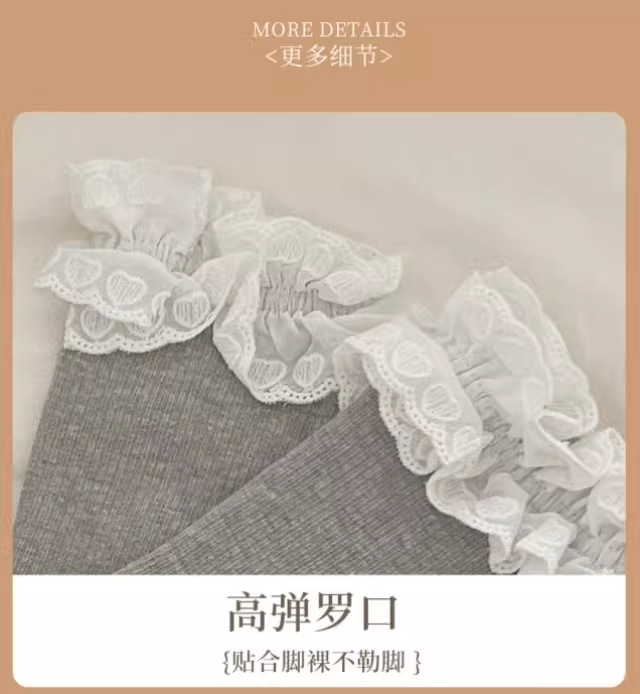 芭蕾风爱心蕾丝花边白色中筒袜透气吸汗百搭休闲堆堆袜jk无骨棉袜 English | 投诉