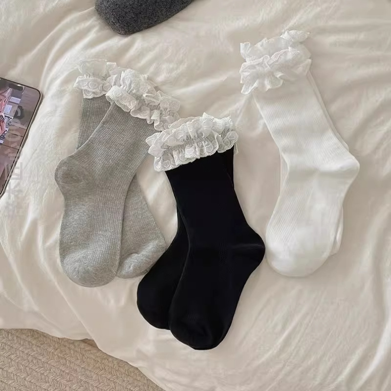 芭蕾风爱心蕾丝花边白色中筒袜透气吸汗百搭休闲堆堆袜jk无骨棉袜