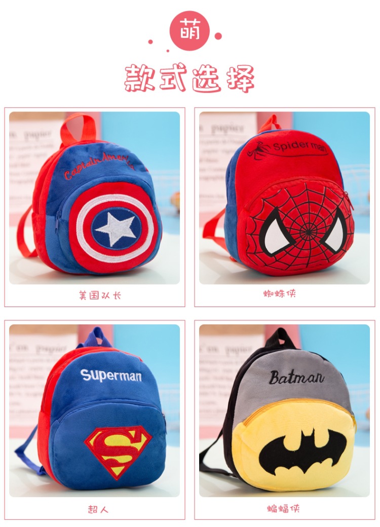 材质: 毛绒 功能: 透气,超轻,可收纳 里料质地: 涤纶 品牌: 谷申 背负系统: 气垫背带 图案: 动漫卡通 适用学龄: 小班 适用性别: 中性/男女均可 颜色: 美国队长包,超人书包,蜘蛛侠书包,蝙蝠侠 货号: 10016 重量: 0.15 kg/个