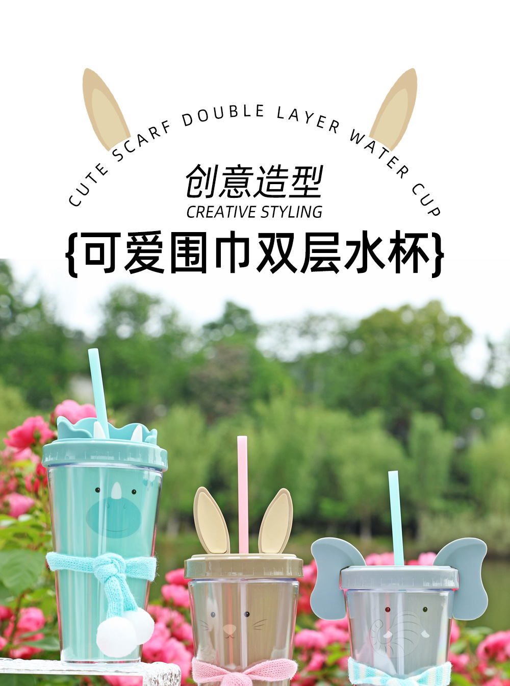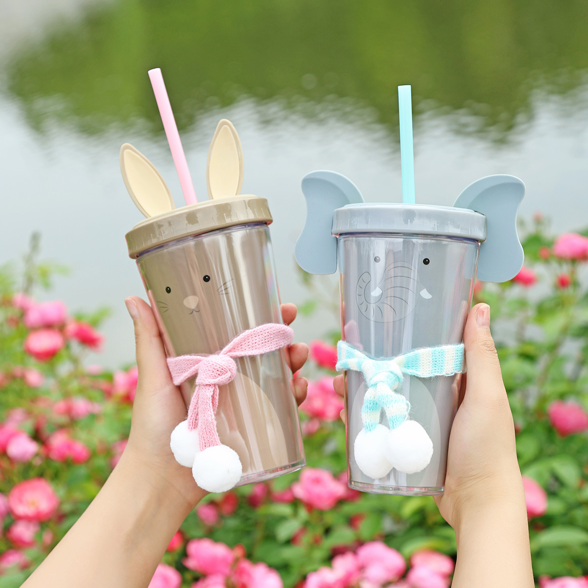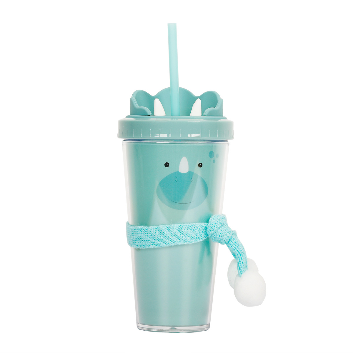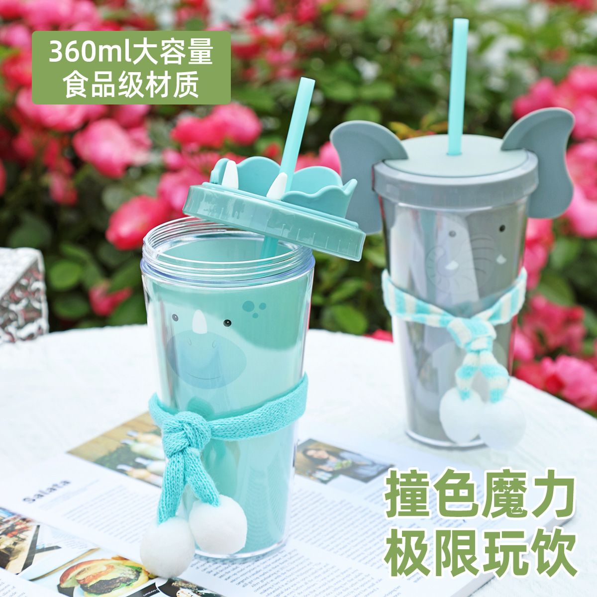 30017  360ml动物卡通水杯双层塑料吸管杯创意塑料吸管杯