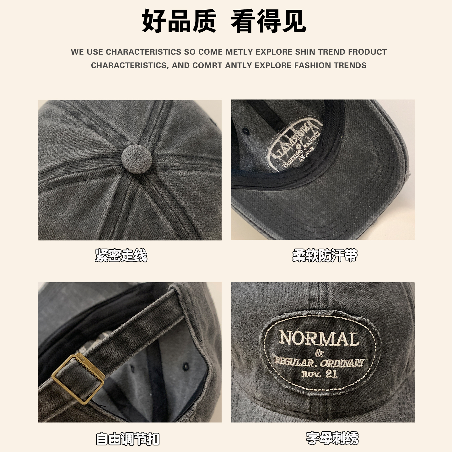 产品类别: 棒球帽 功能: 防晒,透气,保暖,防风,遮阳 面料名称: 棉 主面料成分: 棉 处理工艺: 缎档 品牌: 其他 风格: 休闲风,时尚OL,百搭风,时尚OL风,高 货号: XMZ692-P 图案: 刺绣,LOGO 适合季节: 夏季,春季,春秋季,四季 产地: 义乌 帽顶款式: 圆顶 帽檐款式: 宽檐 颜色: 灰色,咖色,橘色,卡其 尺码: 可调节 是否跨境出口专供货源: 是 主要下游平台: 淘宝,京东,ebay,亚马逊,wish, 主要销售地区: 日韩,非洲,欧洲,南美,东南亚,北美,东 上市年份/季节: 2026年春季 是否可调节: 可调节 重量: 1.0 kg/顶