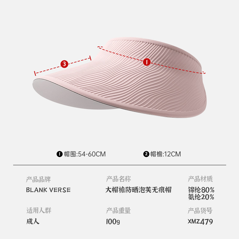 产品类别: 空顶帽 功能: 防晒,透气,遮阳 面料名称: 锦纶 主面料成分: 锦纶 处理工艺: 缎档 品牌: Blank verse 风格: 自然,可爱,甜美 货号: XMZ537-P 图案: 纯色 适合季节: 夏季,春秋季 产地: 金华 帽顶款式: 无顶 帽檐款式: 大檐 颜色: 非质量问题不退不换;请谨慎下单;拍下默认 是否跨境出口专供货源: 是 主要下游平台: 淘宝,京东,ebay,亚马逊,wish, 主要销售地区: 日韩,非洲,欧洲,南美,东南亚,北美,东 上市年份/季节: 2025年春季 是否可调节: 不可调节 主面料成分含量: 71%(含)-80%(含) 重量: 1.0 kg/顶