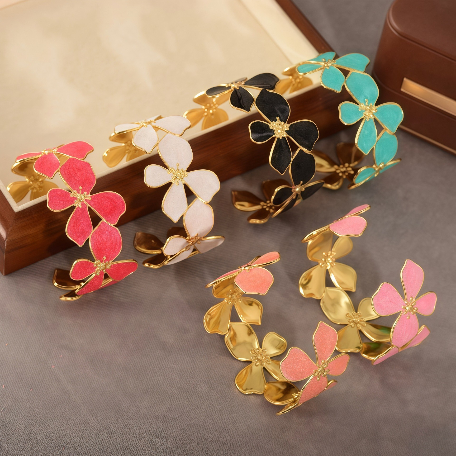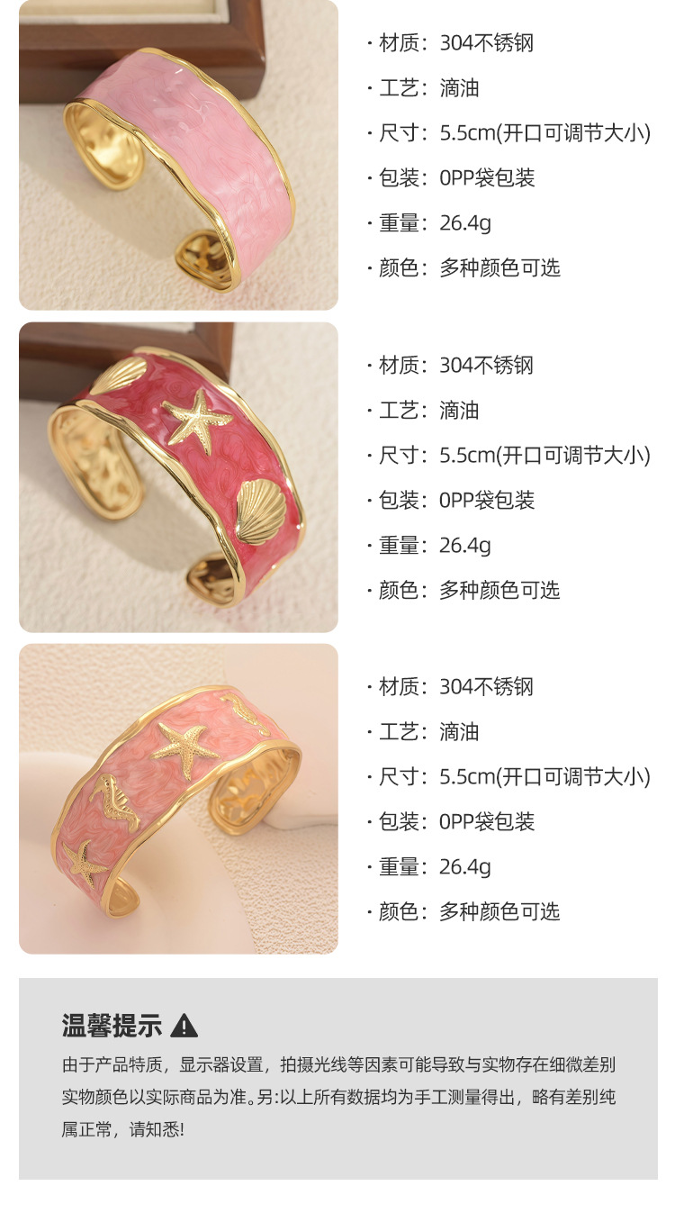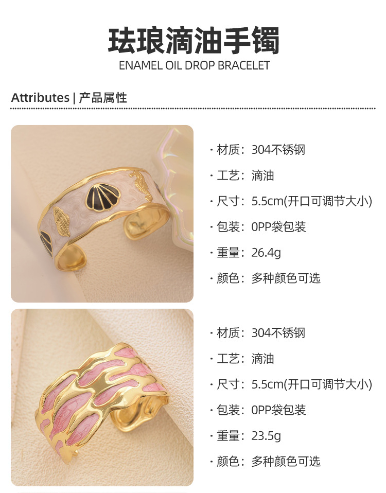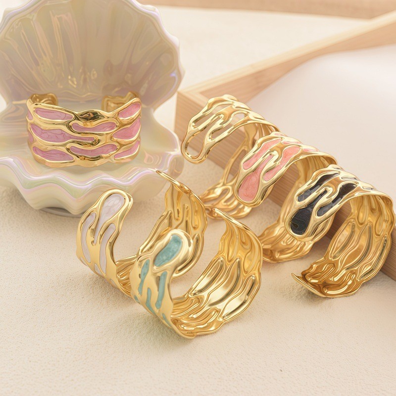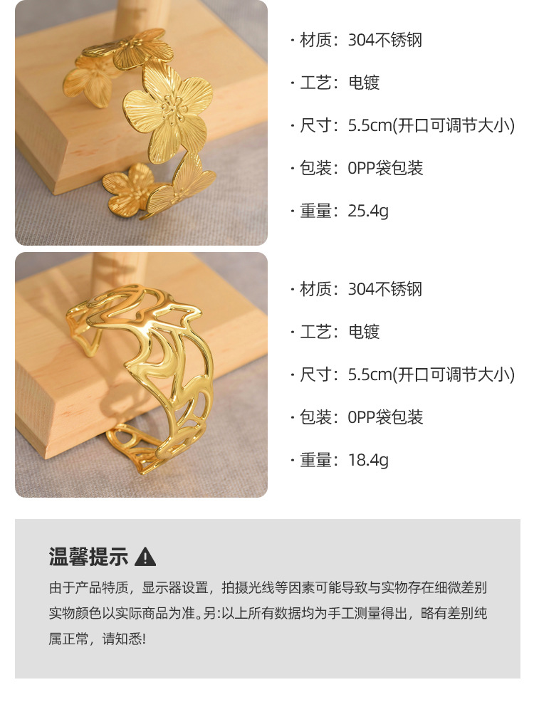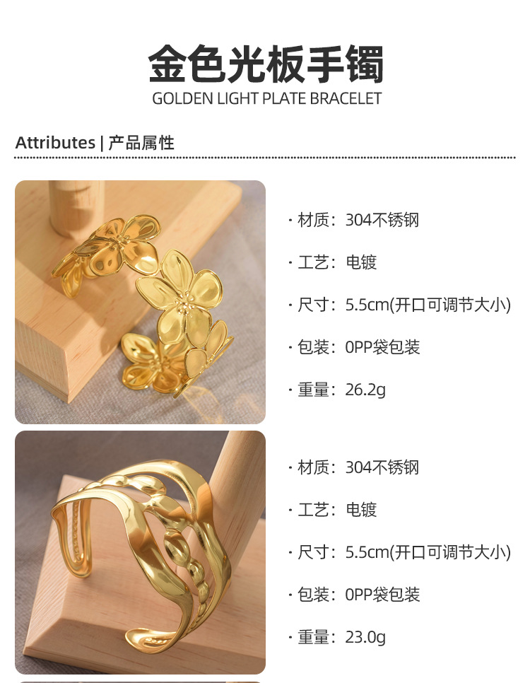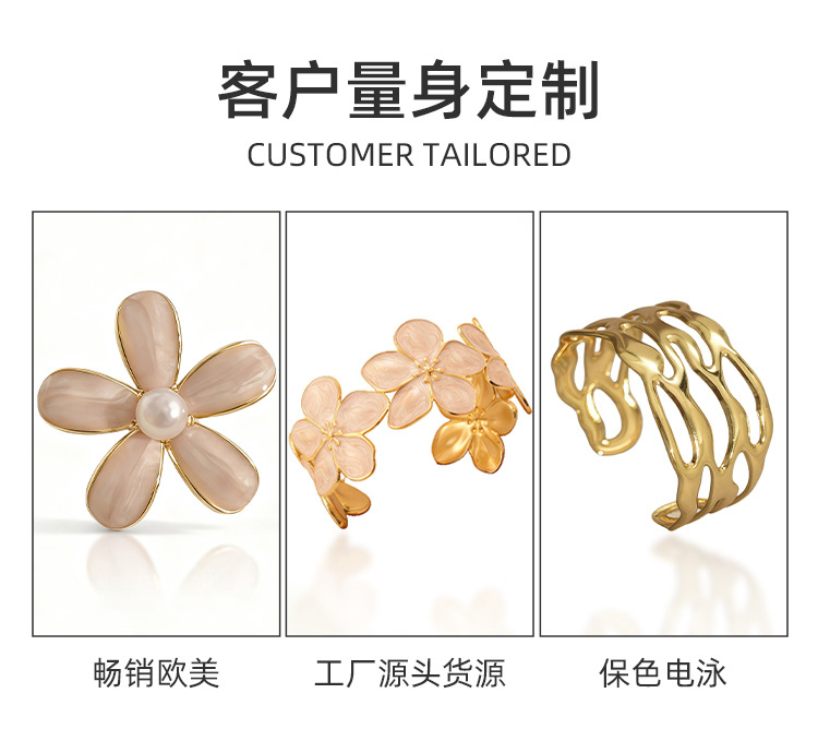 欧美饰品复古珐琅手饰高级感金色宽边手环镂空花朵开口不锈钢手镯 English | 投诉