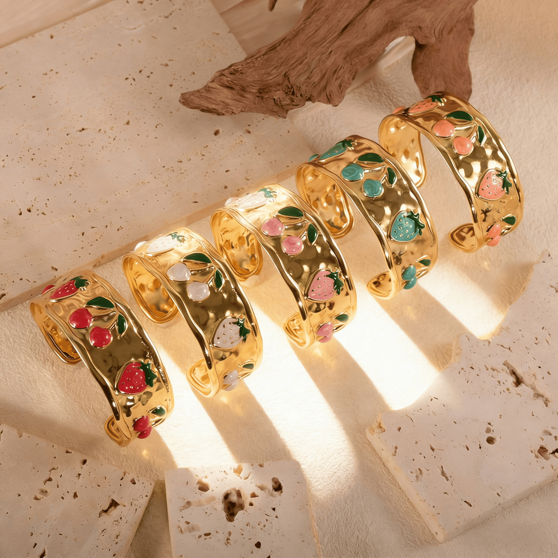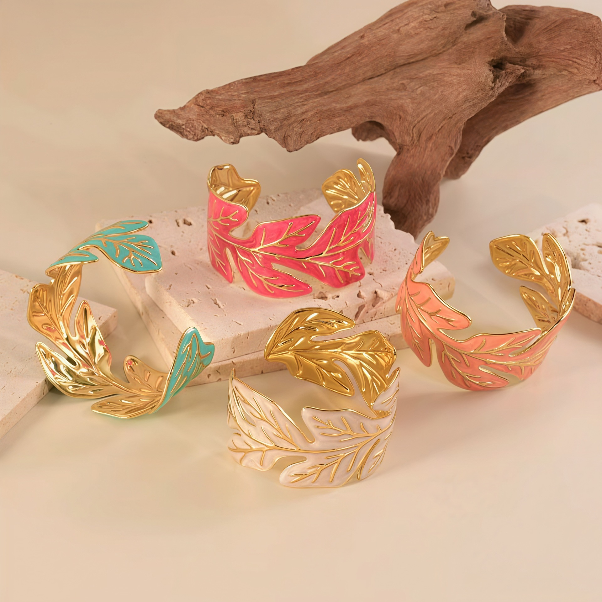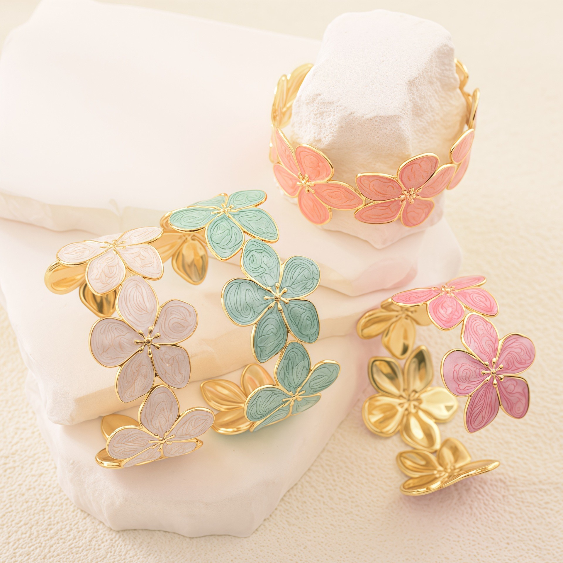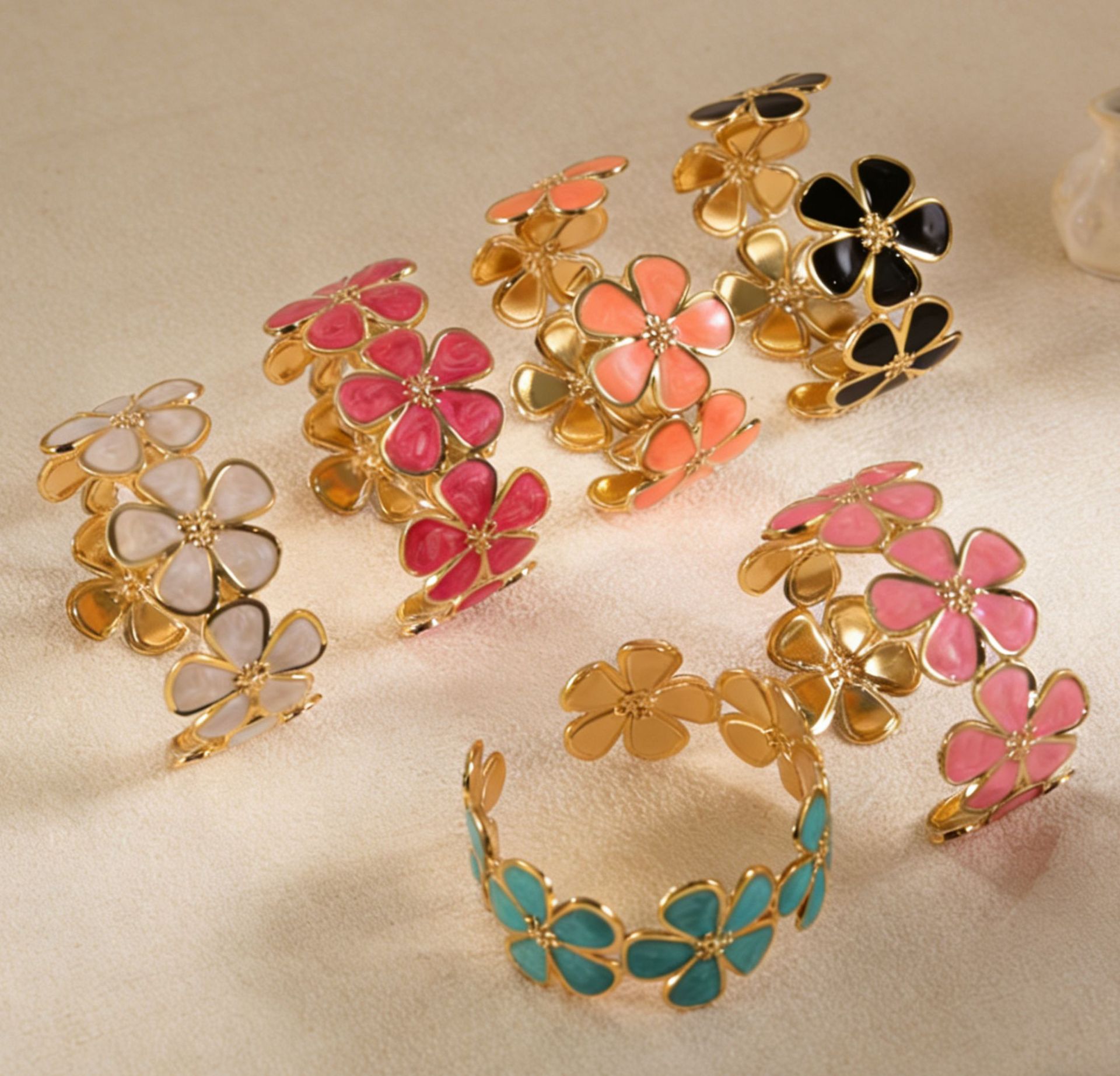 欧美饰品复古珐琅手饰高级感金色宽边手环镂空花朵开口不锈钢手镯 English | 投诉