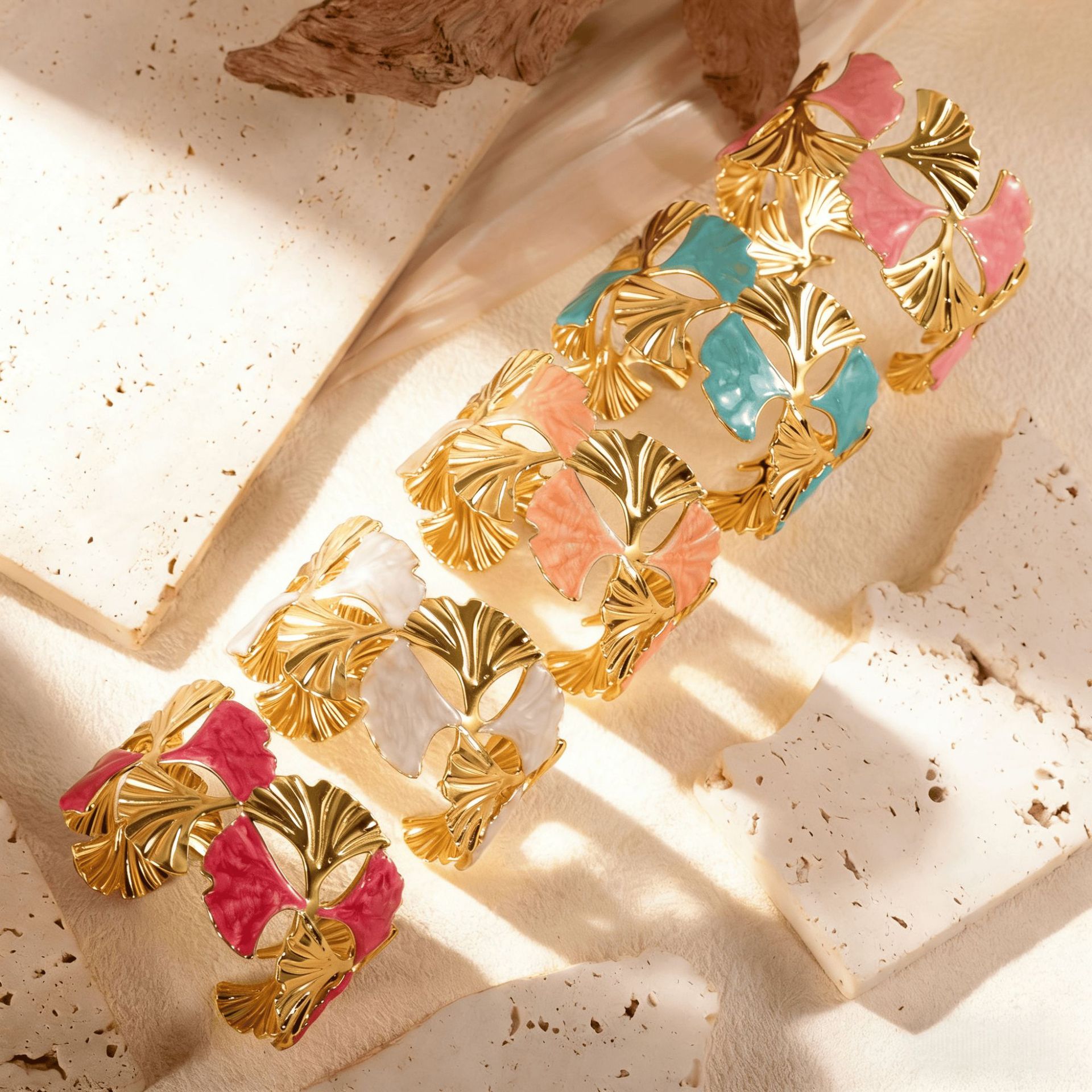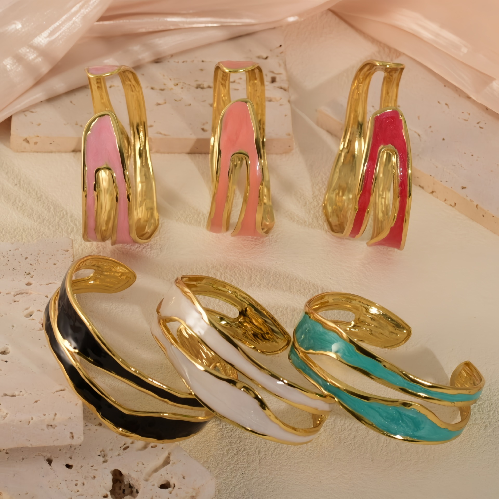 欧美饰品复古珐琅手饰高级感金色宽边手环镂空花朵开口不锈钢手镯