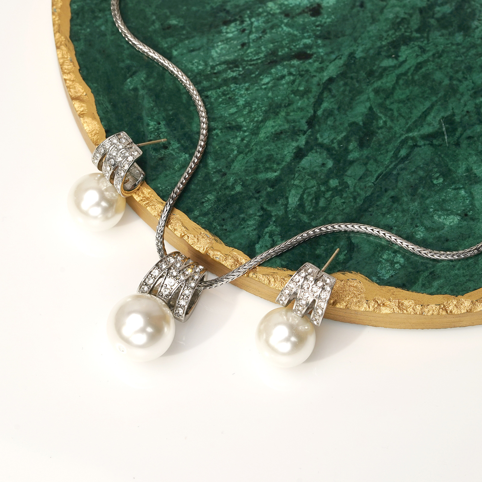 青岛中古珍珠首饰套装耳钉吊坠经典简约字母M镶锆石几何高级项链