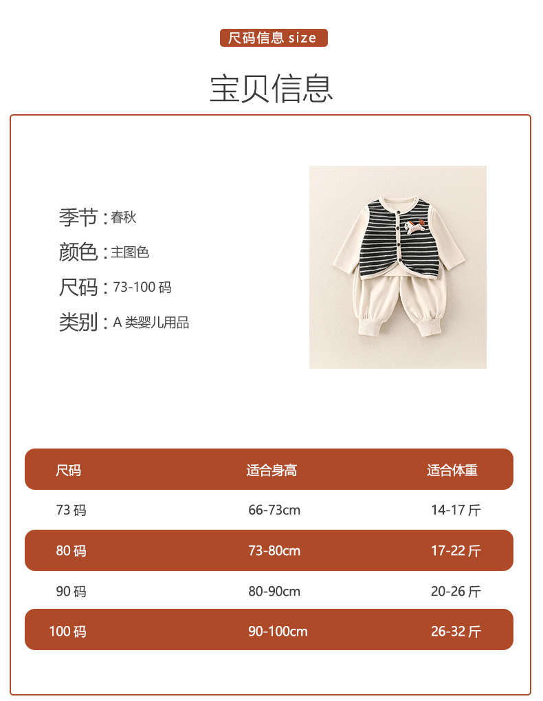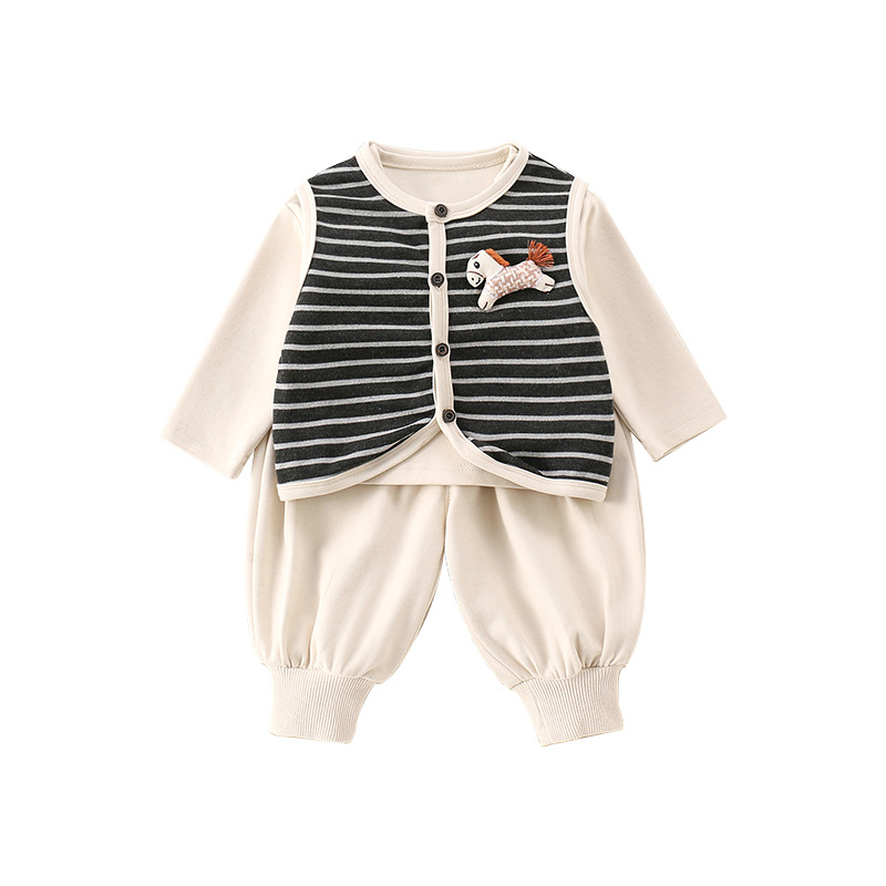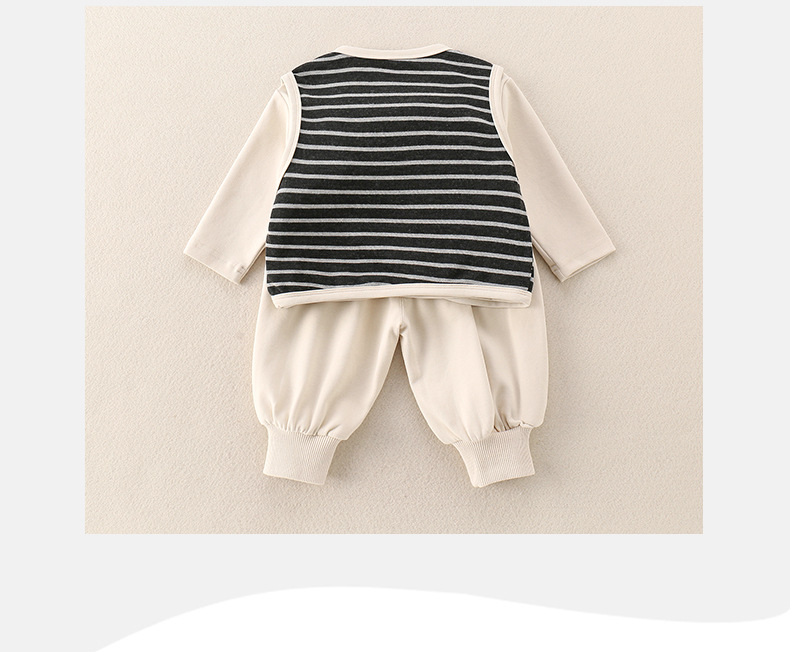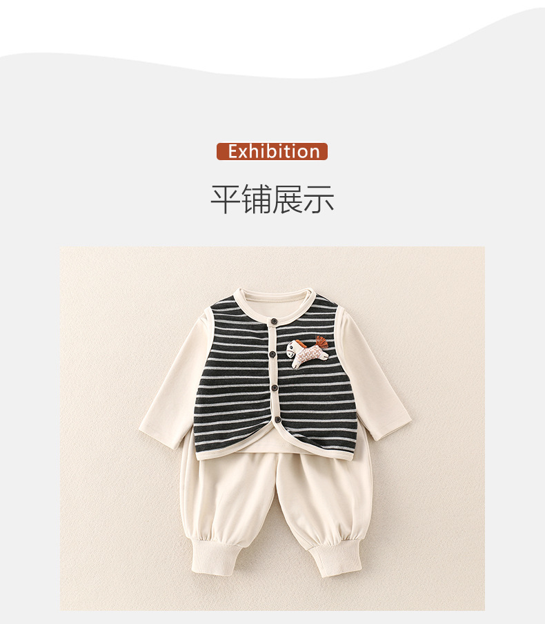 主面料成分: 棉 适合年龄段: 婴幼童(1~3岁,80~100cm) 套装件数: 三件套 品牌: 图图我 厚薄: 普通 面料名称: 其它 袖长: 长袖 裤长: 长裤 货号: 2025-81 货源类别: 现货 适用性别: 中性/男女均可 风格: 休闲 套装类型: 裤套装 礼盒内容: 服装 产地: 浙江 适合季节: 春季,秋季 是否连帽: 不连帽 面料工艺: 柔软处理 图案: 条纹 图片实拍: 实拍无模特 重量: 0.5 kg/套
