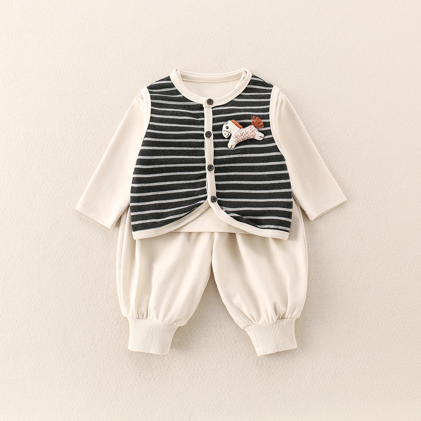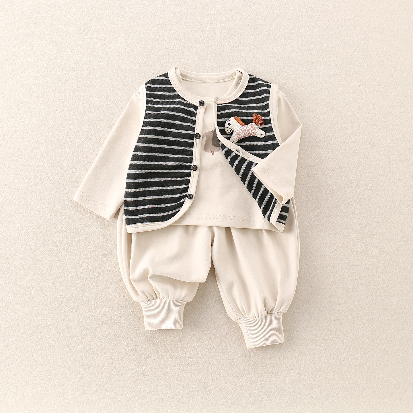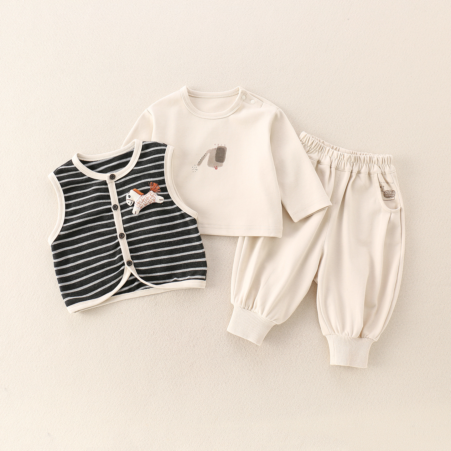 主面料成分: 棉 适合年龄段: 婴幼童(1~3岁,80~100cm) 套装件数: 三件套 品牌: 图图我 厚薄: 普通 面料名称: 其它 袖长: 长袖 裤长: 长裤 货号: 2025-81 货源类别: 现货 适用性别: 中性/男女均可 风格: 休闲 套装类型: 裤套装 礼盒内容: 服装 产地: 浙江 适合季节: 春季,秋季 是否连帽: 不连帽 面料工艺: 柔软处理 图案: 条纹 图片实拍: 实拍无模特 重量: 0.5 kg/套