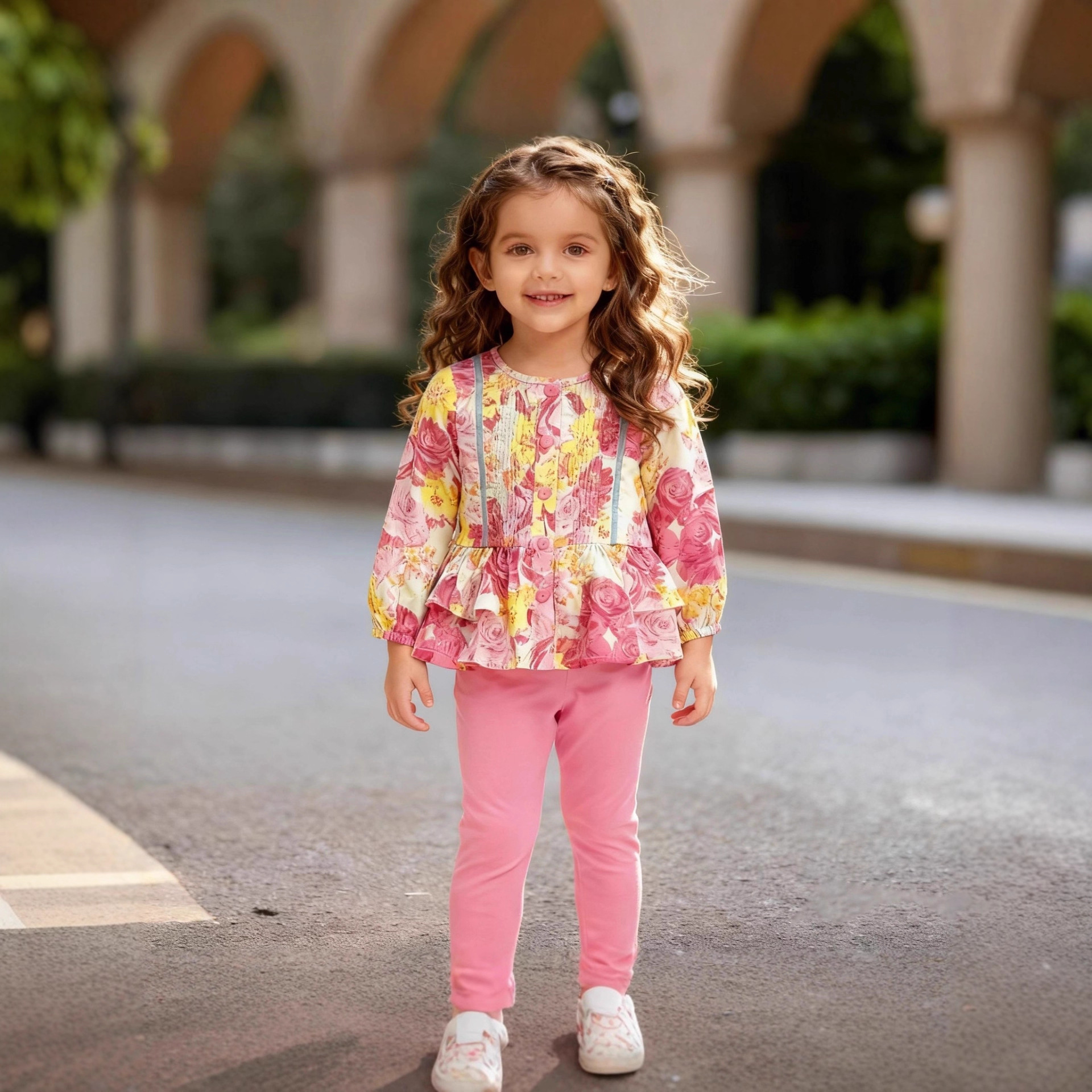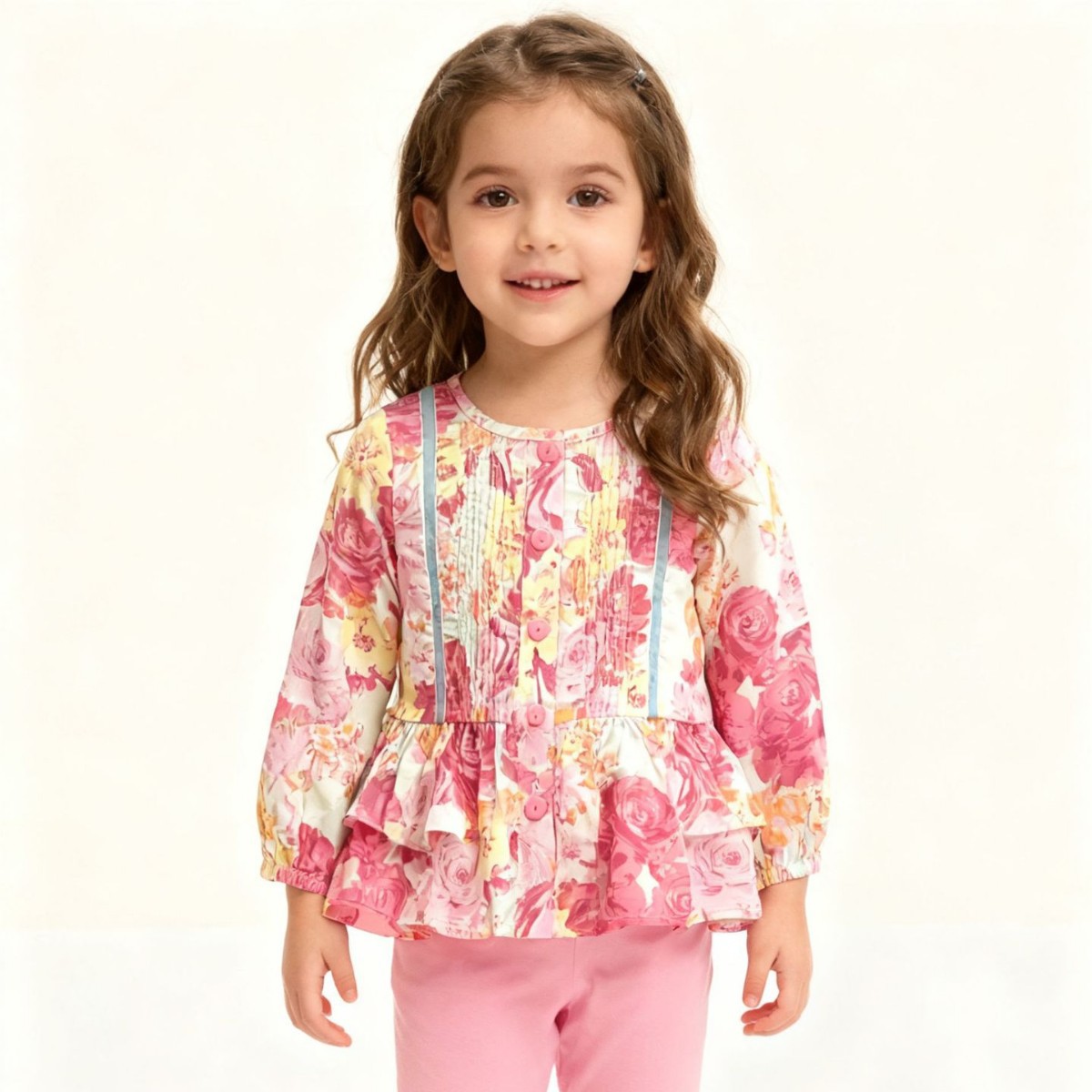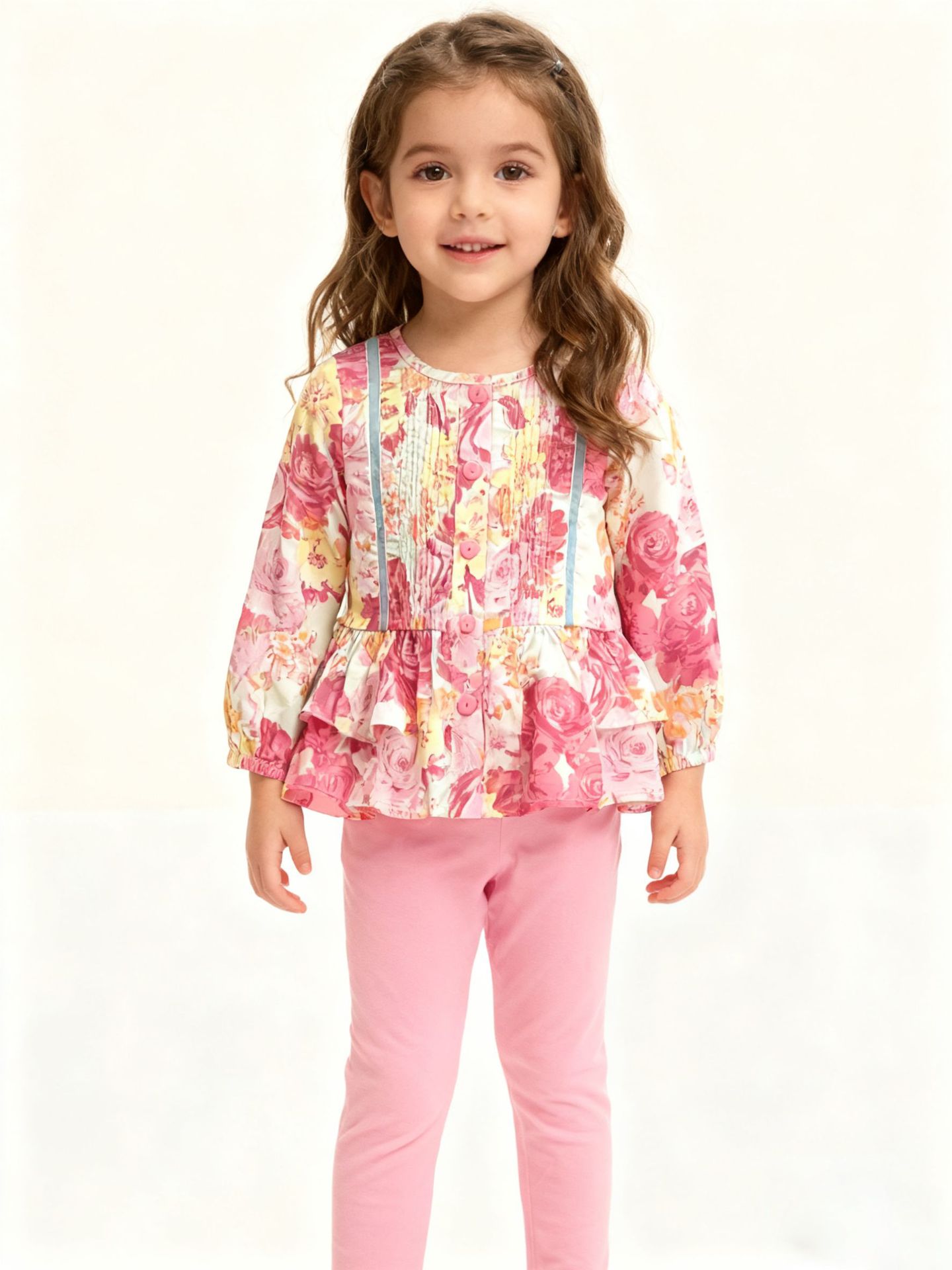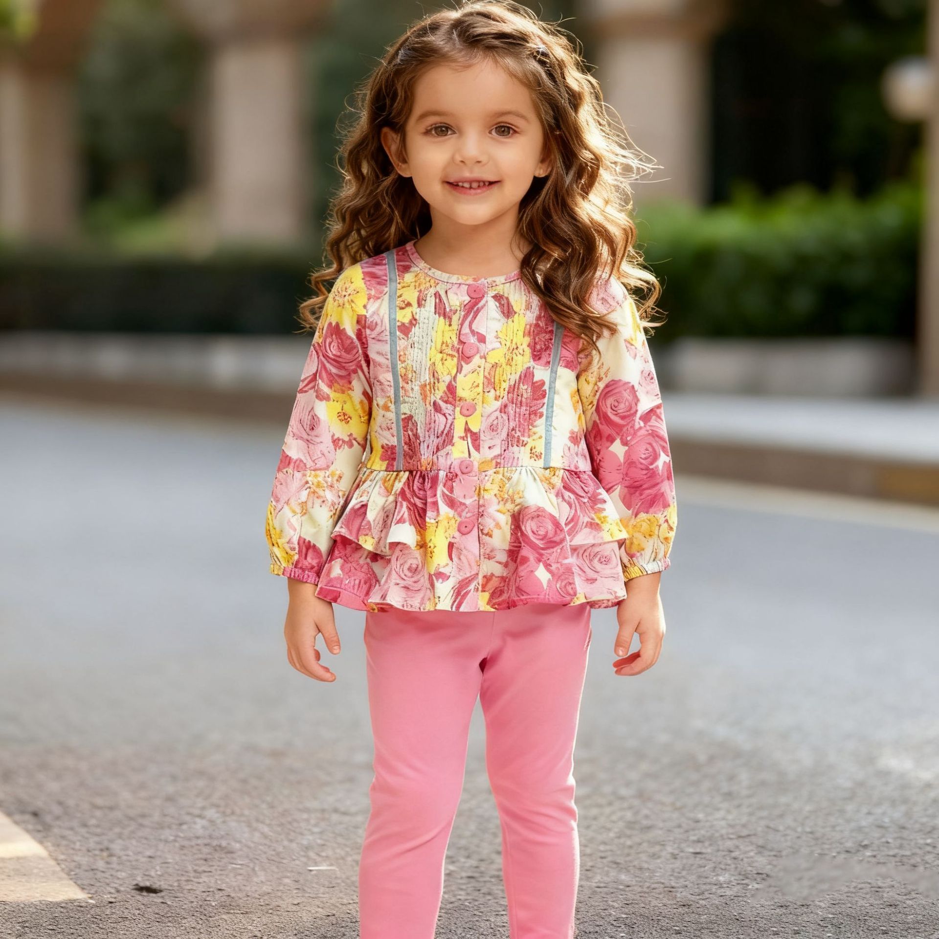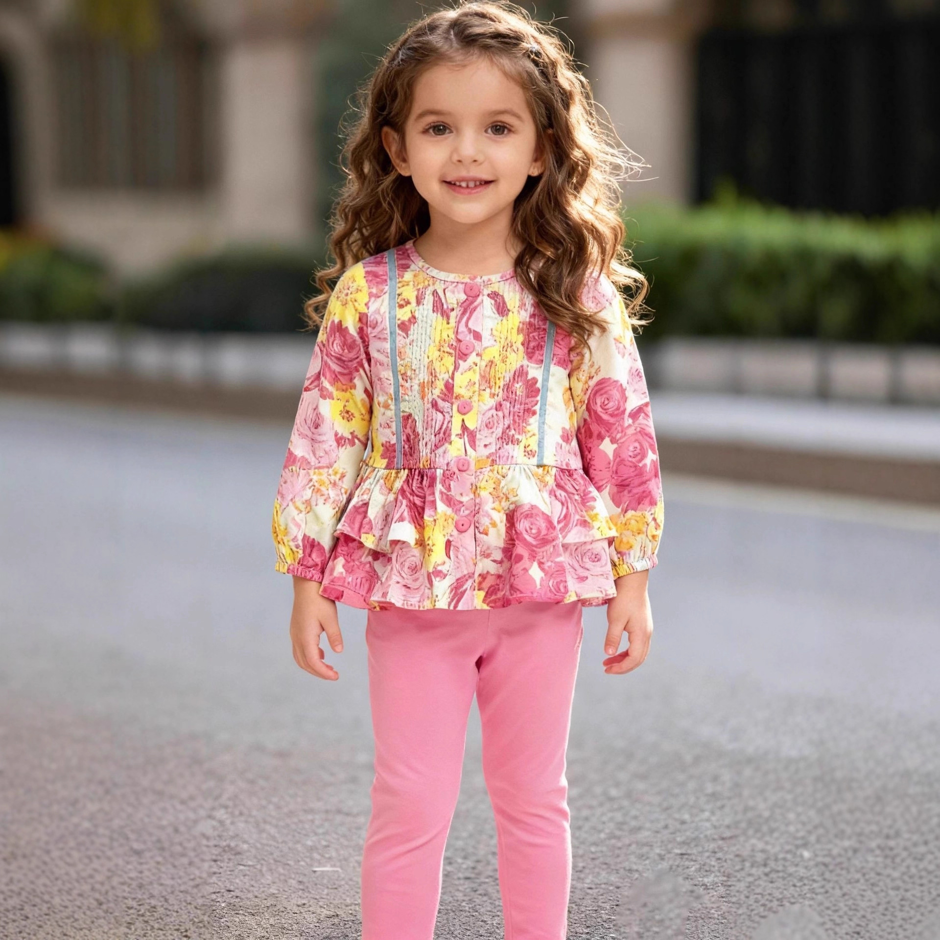 跨境2026春夏新品女童家居欧美中小套装舒适印花可爱带扣子两件套