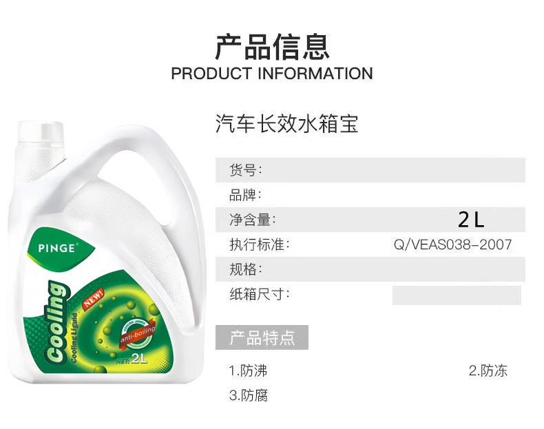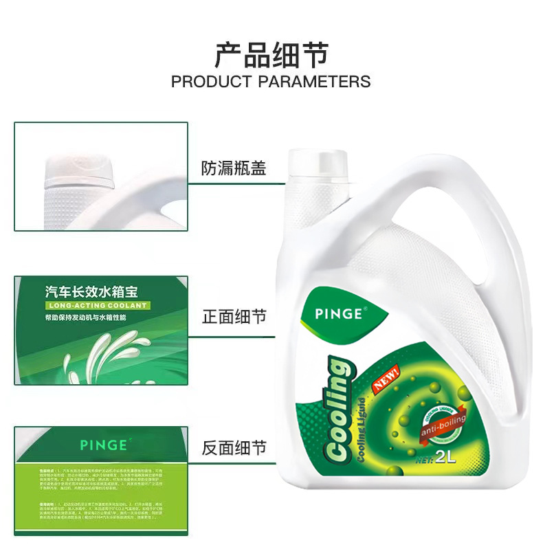 品牌: PINGE 材质: PET+液体 产地: 广州 加工定制: 否 用途: 汽车水箱保养、防水箱高温 型号: PG水箱宝2L 货号: PG水箱宝2L-00 主要下游平台: ebay,亚马逊,wish,速卖通,独立 主要销售地区: 非洲,欧洲,南美,东南亚,北美,东北亚, 有可授权的自有品牌: 是