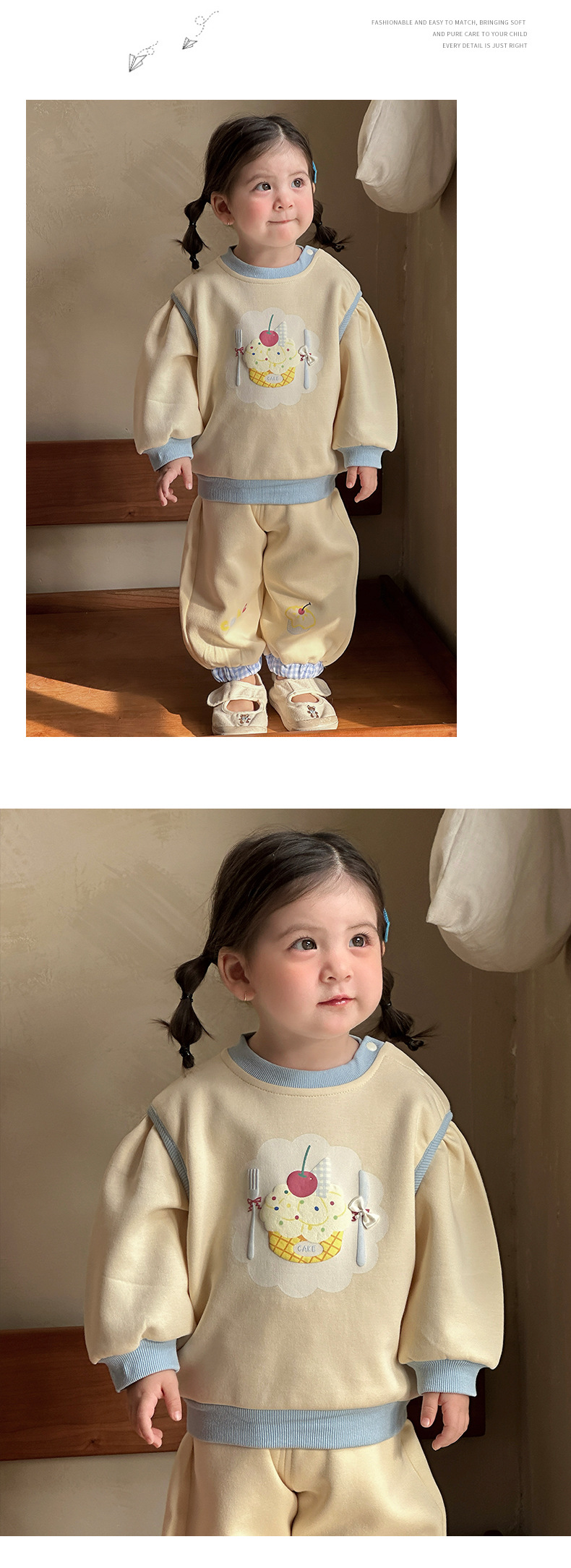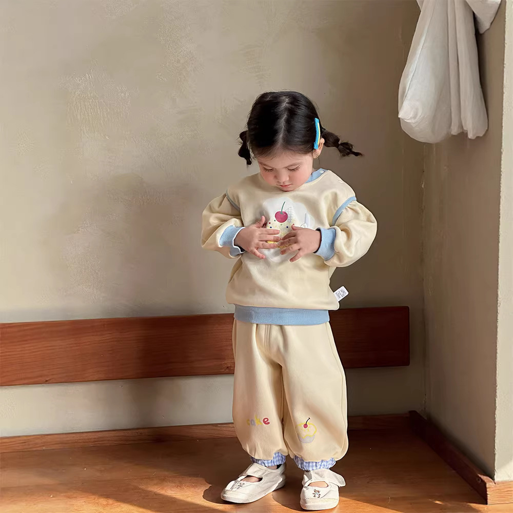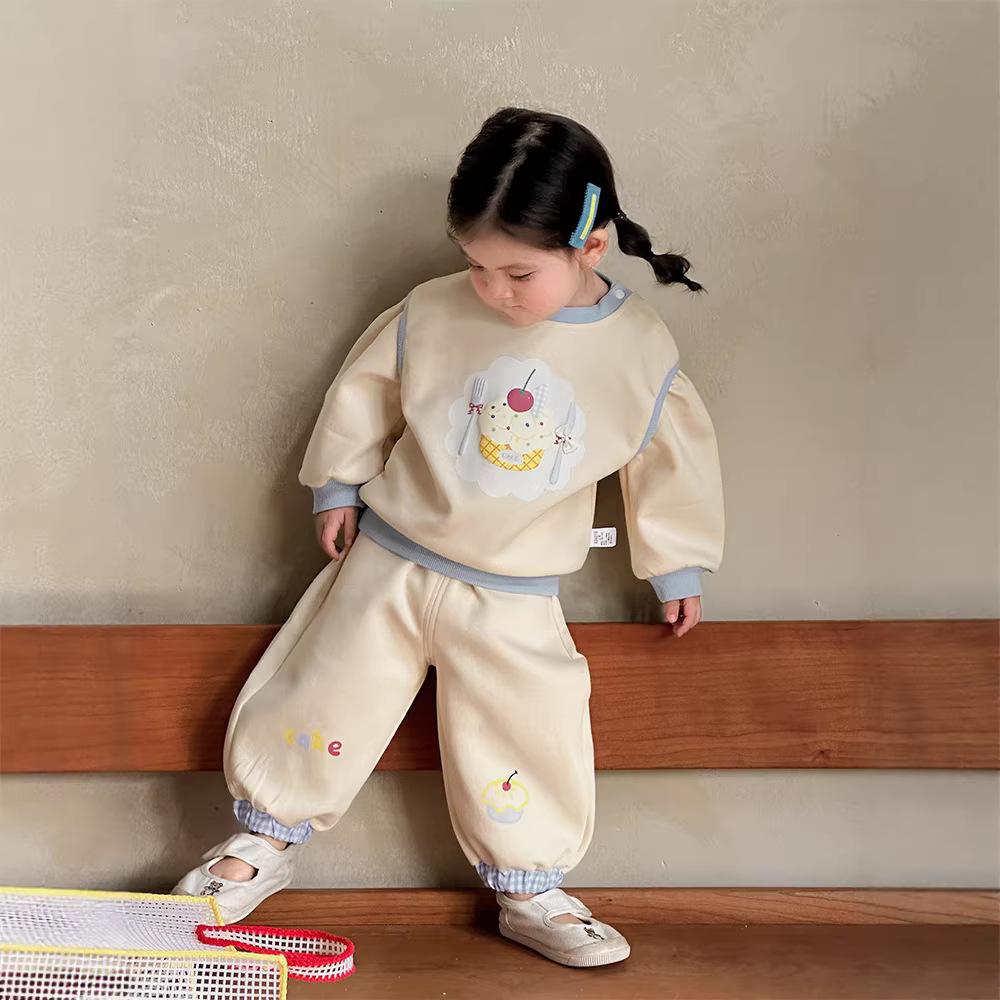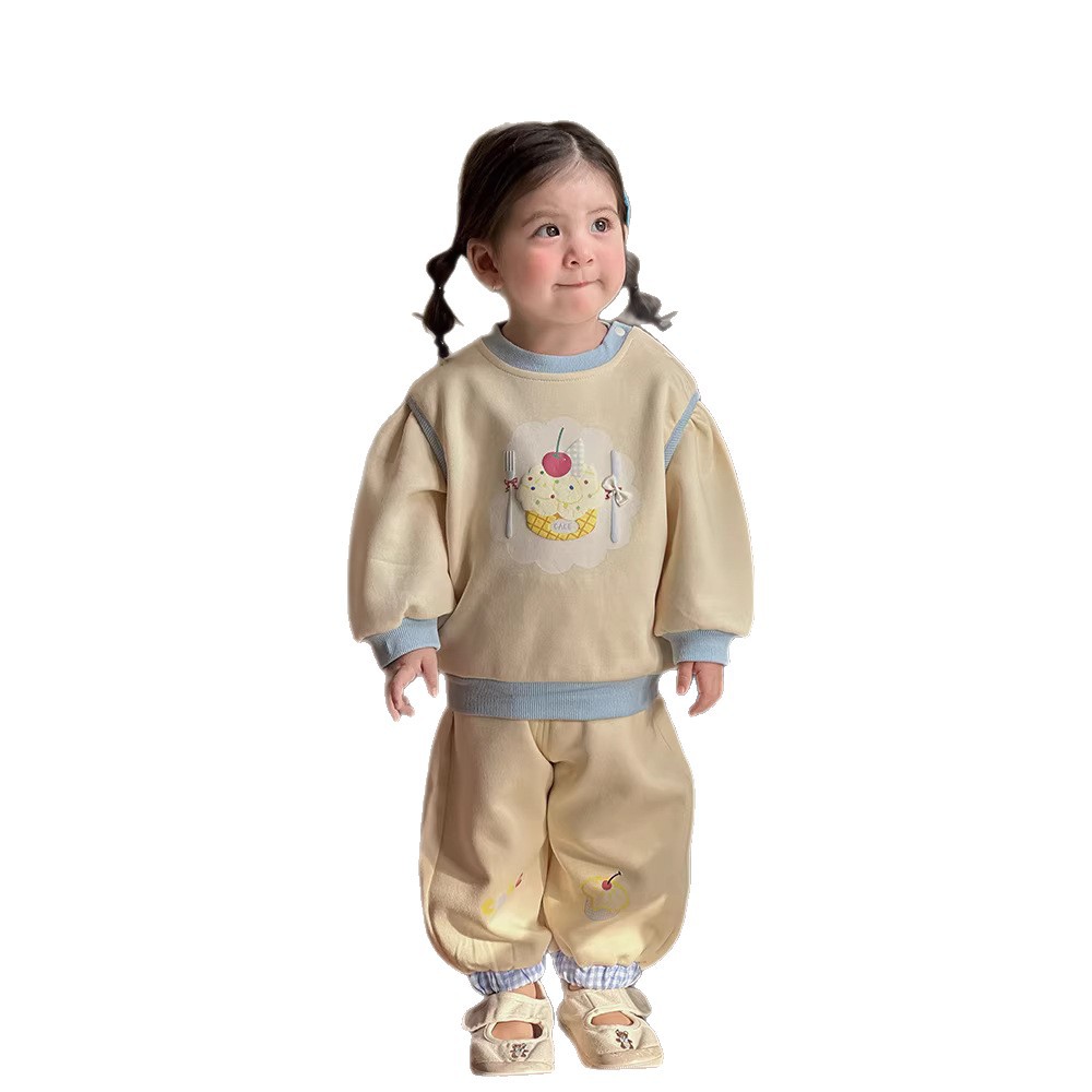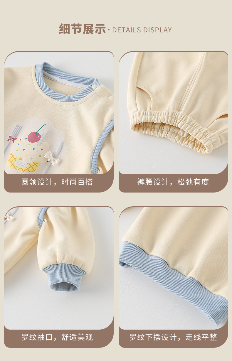 主面料成分: 棉 适合年龄段: 婴幼童(1~3岁,80~100cm) 套装件数: 两件套 品牌: 多呦呦 厚薄: 普通 面料名称: 棉 袖长: 长袖 裤长: 长裤 货号: 626015甜品套装 货源类别: 现货 适用性别: 女 风格: 甜美 套装类型: 裤套装 礼盒内容: 服装 产地: 浙江 适合季节: 春季,秋季 是否连帽: 不连帽 面料工艺: 柔软处理 图案: 卡通 图片实拍: 实拍有模特 重量: 0.5 kg/套