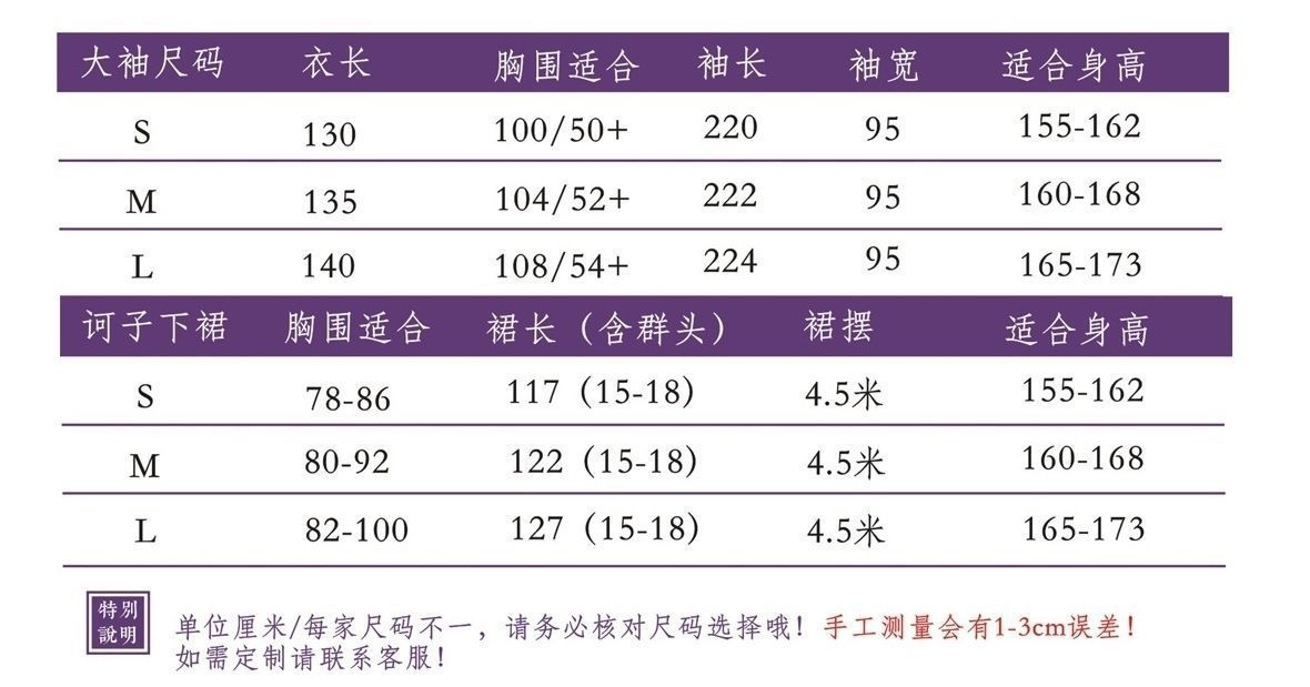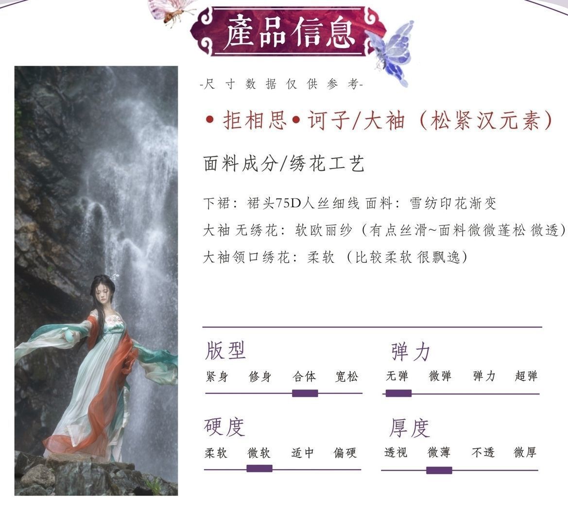品牌: 其它 上市年份/季节: 2024年夏季 面料名称: 雪纺 主面料成分: 涤纶(聚酯纤维) 主面料成分含量: 90%(不含)-95%(含) 主面料成分2: 涤纶(聚酯纤维) 主面料成分2含量: 90%(不含)-95%(含) 颜色: 【拒相思】大袖衫+裙子+披帛 尺码: S,M,L,XL,2XL 适用季节: 四季 元素: 绣花 印染 渐变 款式: 襦裙 图案: 其它 货号: 202505142339 制式: 唐制 流行元素: 渐变色 适用性别: 女 袖型: 广袖 朝代: 唐制 工艺: 刺绣/绣花 重量: 0.5 kg/件