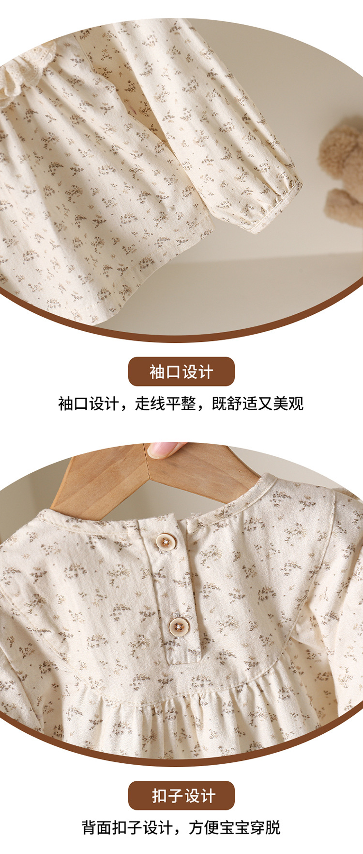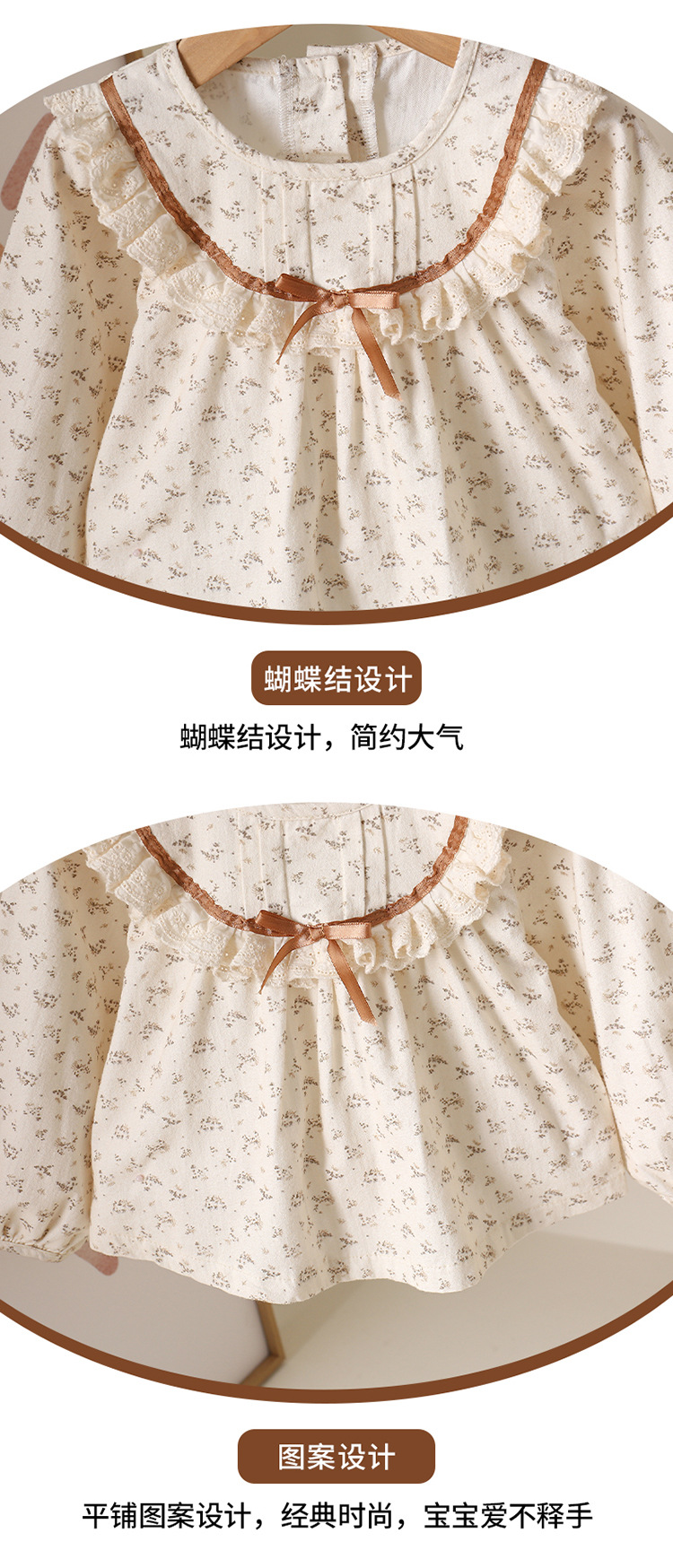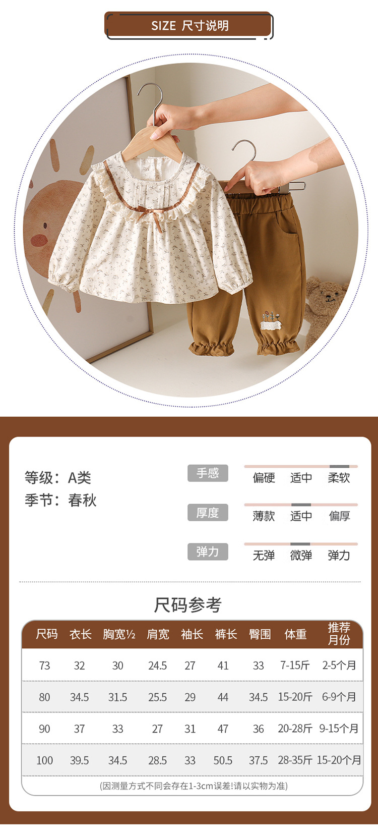 主面料成分: 棉 适合年龄段: 新生儿(0~1岁,80cm及其以下) 套装件数: 两件套 品牌: 多呦呦 厚薄: 普通 面料名称: 棉类混纺 袖长: 长袖 裤长: 长裤 货号: 6670 咖色小花套装 货源类别: 现货 适用性别: 中性/男女均可 风格: 甜美 套装类型: 裤套装 礼盒内容: 服装 产地: 浙江 适合季节: 春季,秋季 是否连帽: 不连帽 面料工艺: 柔软处理 图案: 其他 图片实拍: 实拍无模特 重量: 0.5 kg/套