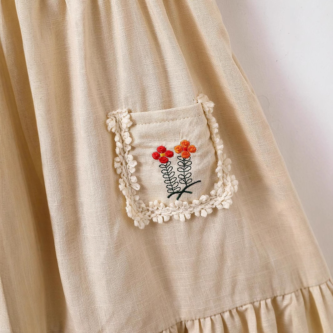 跨境电商复古花边女童连衣裙刺绣花边小口袋沙滩度假连衣裙代发