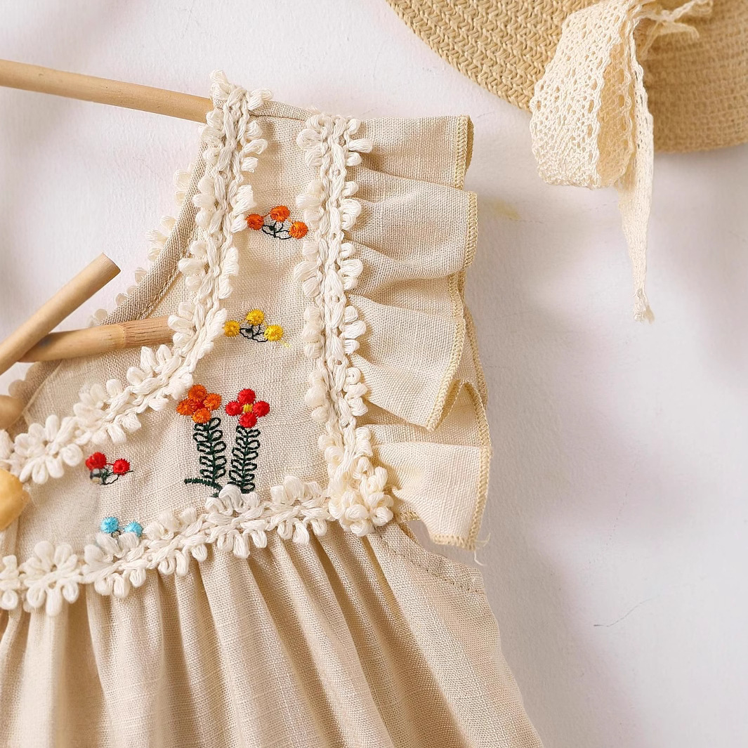 跨境电商复古花边女童连衣裙刺绣花边小口袋沙滩度假连衣裙代发 English | 投诉