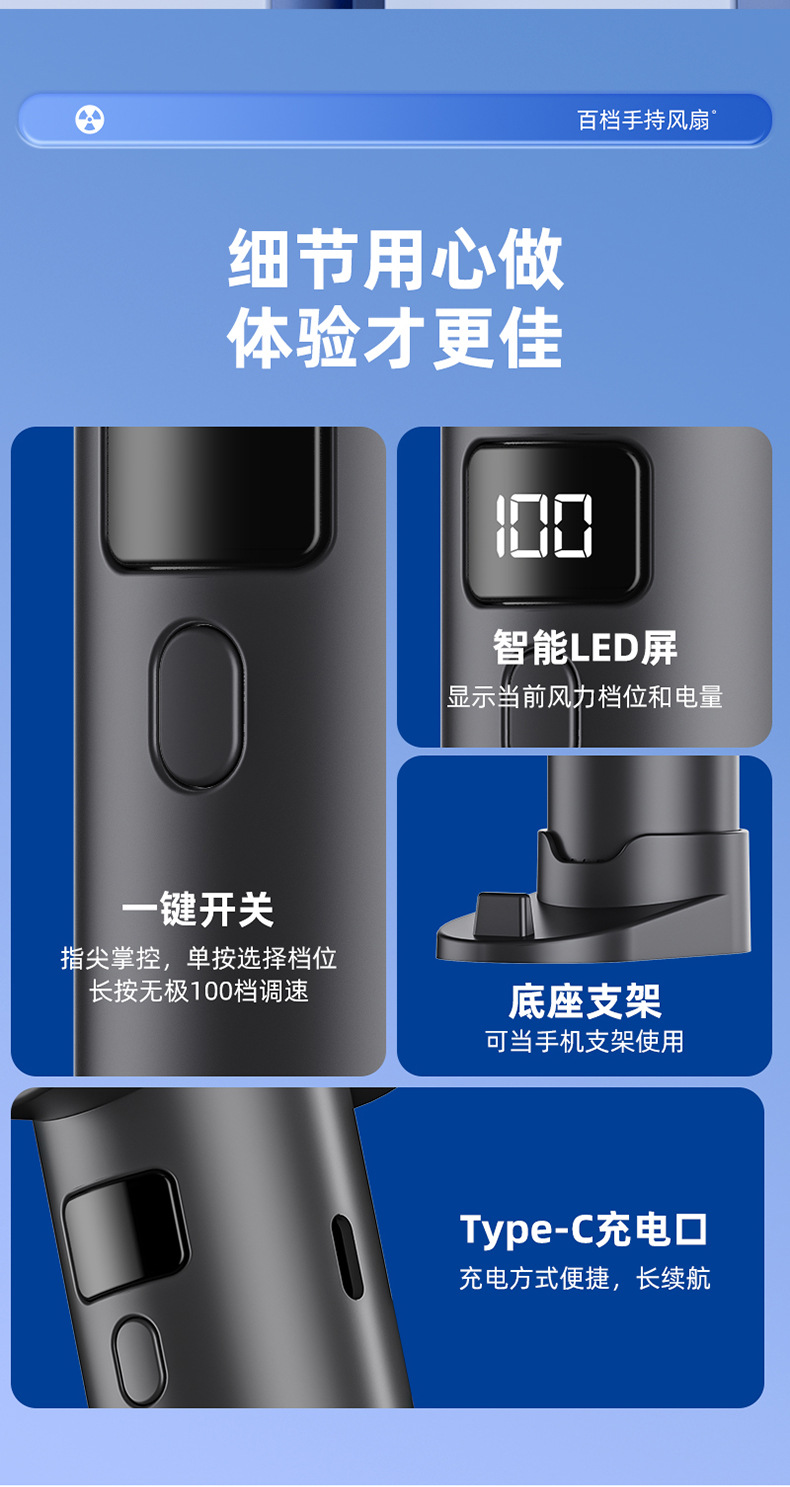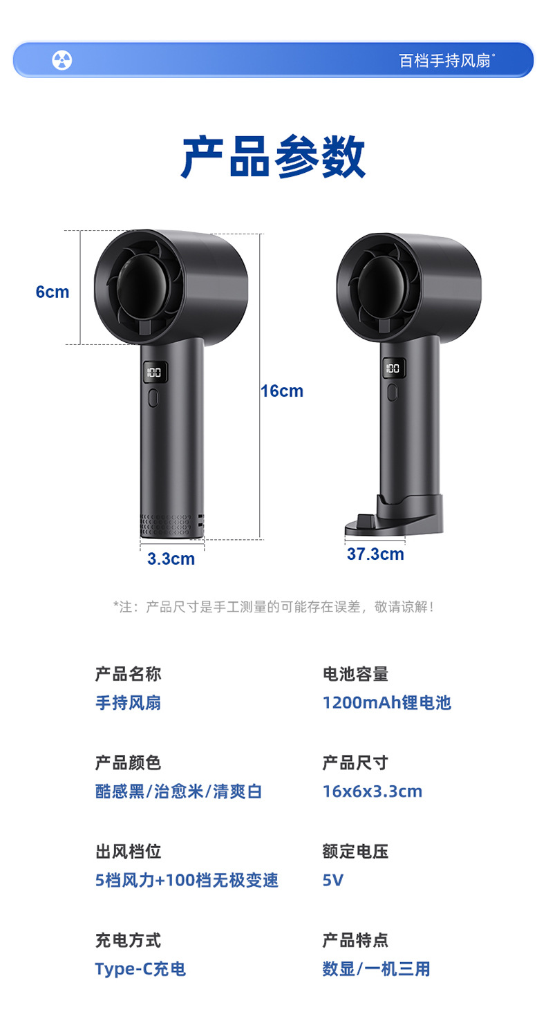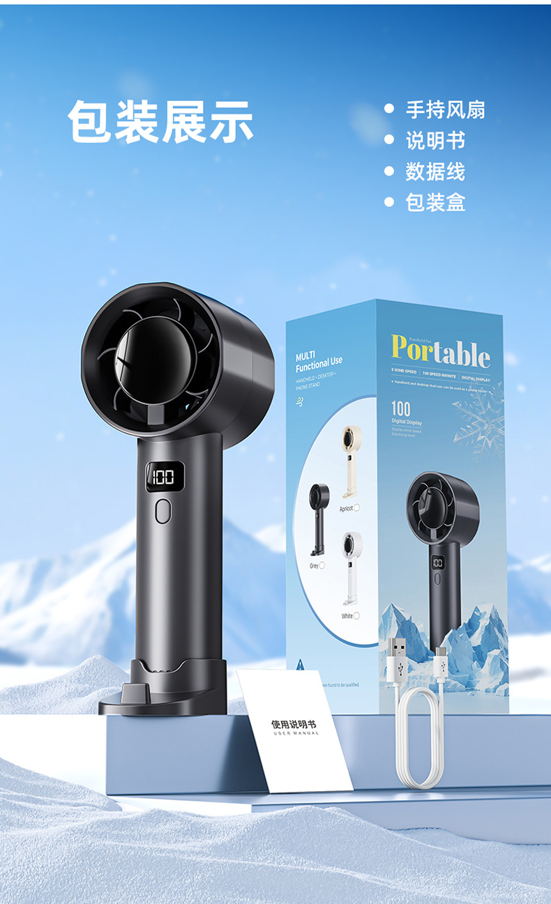 品牌: 其它 扇叶材质: 其它 续航时长: 1-3h(含) 电源方式: 锂电池 外观尺寸: 16*6*3.3cm 附加功能: 高续航、手持/站立、风速显示、电量显示 是否内置电池: 内置电池 内置蓄电池容量: 1000mAh-1200mAh(含) 是否专利货源: 否 货号: F103