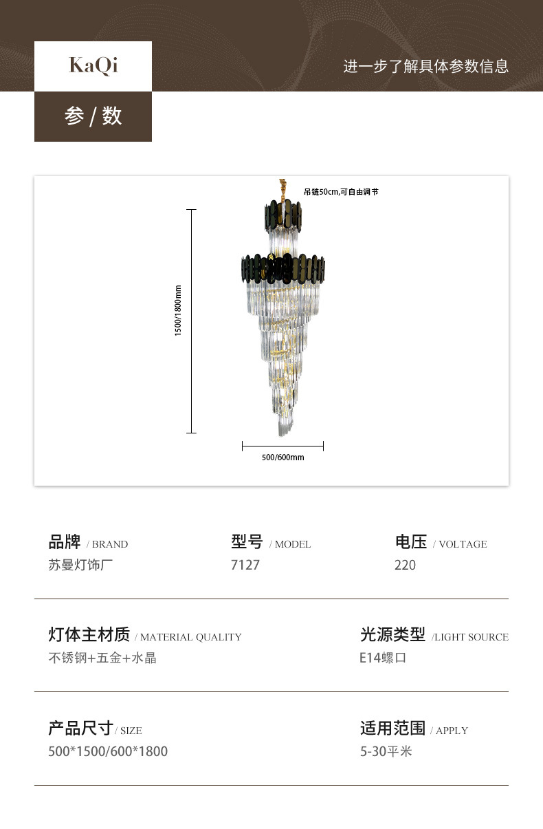 光源类型: led灯 头数: 单头吊灯 灯身材质: 五金+不锈钢+水晶 智能类型: 21915361688 品牌: 云羽照明 电压: 220 风格: 后现代 吊灯类型: 水晶吊灯 认证: 无 可调节高度: 50 平均使用寿命: 咨询客服 灯光颜色: 500*H1500,600*H1800 光源功率: 不包灯源 照射面积: 15㎡ -30㎡ 是否跨境出口专供货源: 是 是否配送上门: 不配送上门 是否有专利: 否 适用场景: 家居场所 是否可提供安装服务: 否 外形尺寸: 500*H1500,600*H1800