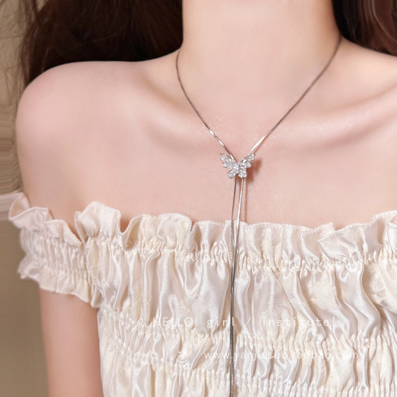银色闪锆蝴蝶长款流苏项链女可抽拉锁骨链颈链配饰小众设计项链