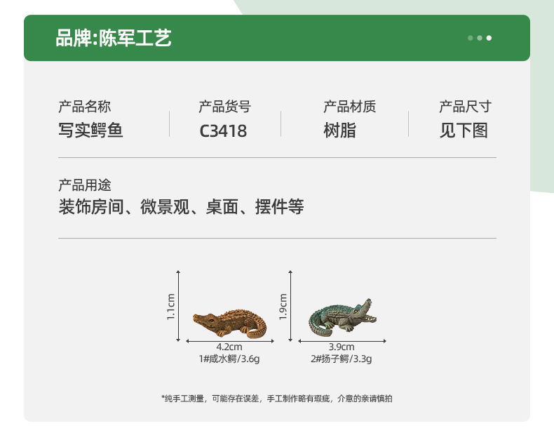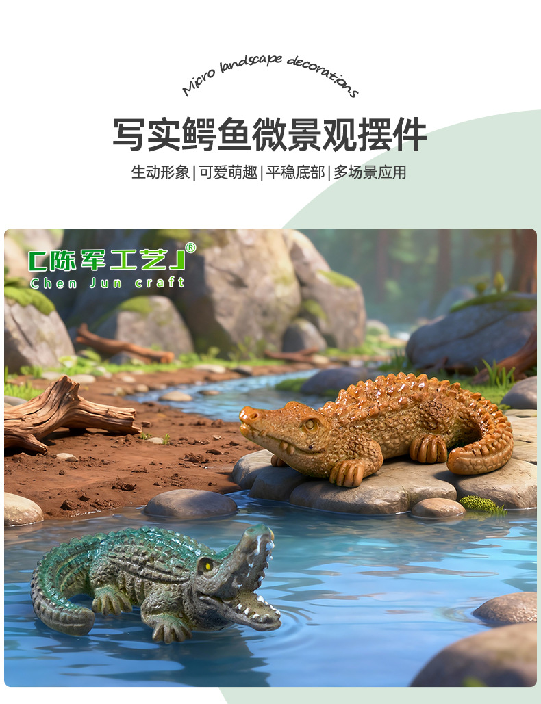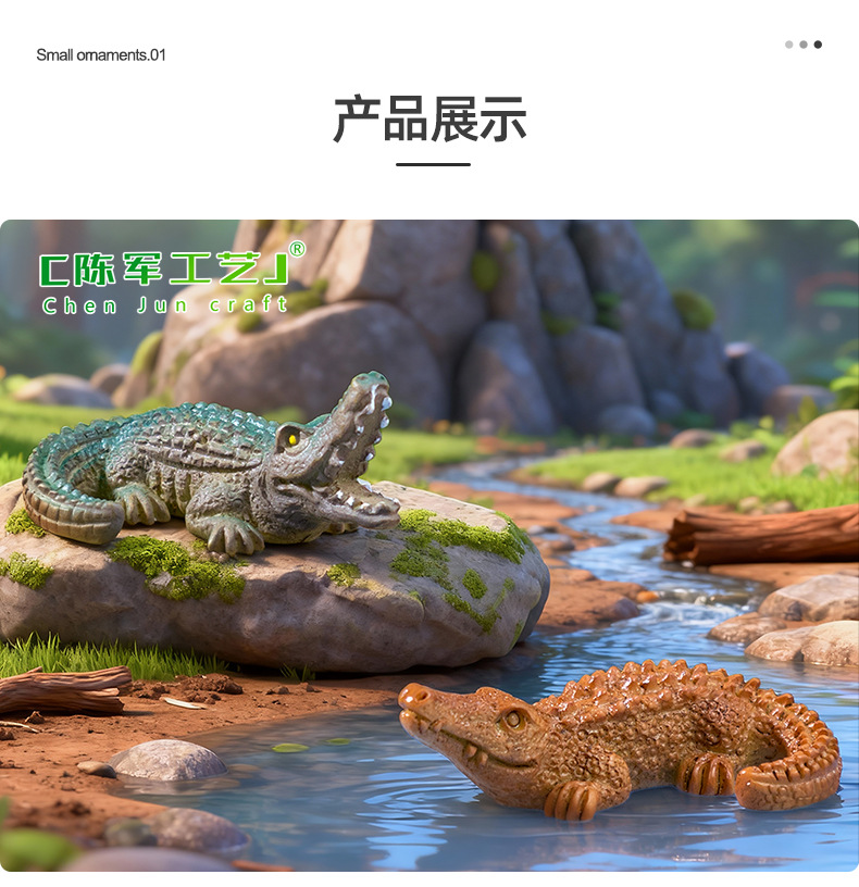 材质: 树脂 类别: 树脂工艺品 风格: 卡通 品牌: 陈军工艺 包装: 普通包装 适用节日: 通用 货号: C3418 是否专利货源: 否 颜色: 1#咸水鳄,2#扬子鳄 尺寸: 写实鳄鱼