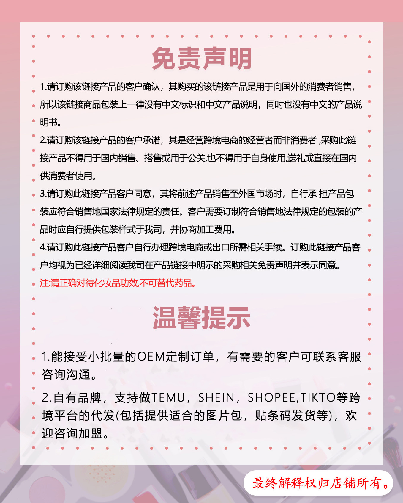 • 本公司承接各种外贸,实体店,电商订单,一件代发、量大价优,欢迎进店咨询。