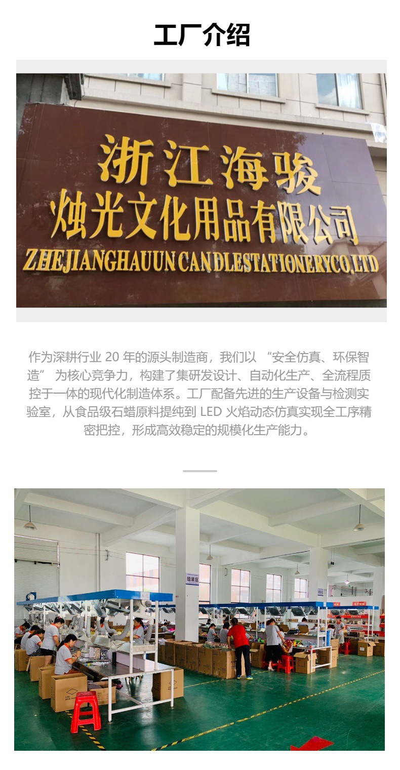 义乌市海骏电子厂作为集生产、加工、经销、批发于一体的综合性企业,深耕 LED 发光产品领域 10 余年,构建了从研发设计到全球分销的全链条服务体系,依托完整的 ISO 9001 质量管理体系与海内外 30 + 家优质原料供应商建立长期战略合作,通过规模化采购与精细化生产管控实现 “高品质、优价格” 的产品竞争力,专注生产 LED 电子蜡烛(含摇杆 / 遥控 / 声控款)、智能夜灯、指形灯、光纤编织带等全品类发光产品,所有产品均通过 CE-EMC、ROHS 等国际认证,凭借仿真火焰技术与低功耗电路设计在欧美节日装饰市场形成差异化优势,自有 10000㎡标准化厂房兼具 OEM/ODM 定制与现货批发能力,支持 48 小时快速打样与大规模订单交付,通过 “薄利多销” 原则与供应链整合使同类产品价格较市场平均低 15%-20%,连续 8 年获 “重合同守信用企业” 认证并获阿里巴巴国际站 “金品诚企” 认证,成为沃尔玛等零售巨头指定供应商,产品经 SGS 第三方检测核验,可提供香型石蜡调配、火焰模式编程、智能模块开发等定制服务及从包装设计到全球物流的一站式解决方案,现货 24 小时内发货、定制订单交期 15-30 天,诚邀全球贸易商共享义乌产业集群资源,莅临指导与洽谈业务。