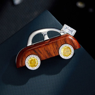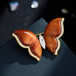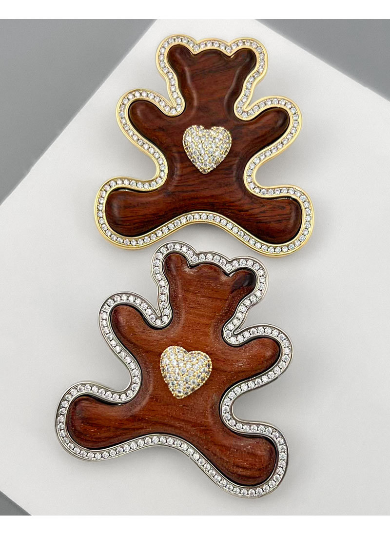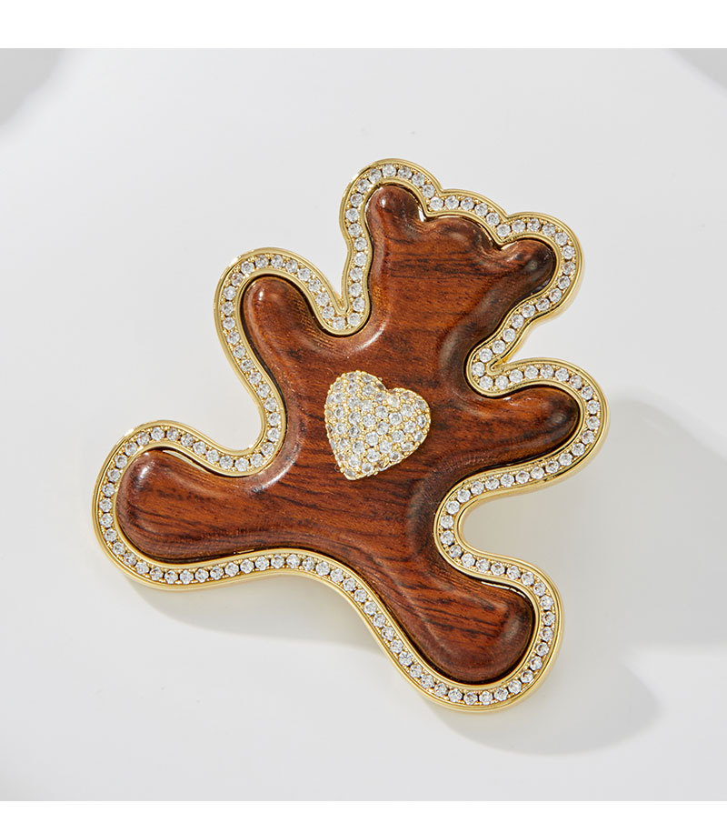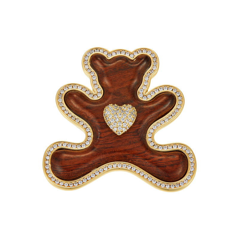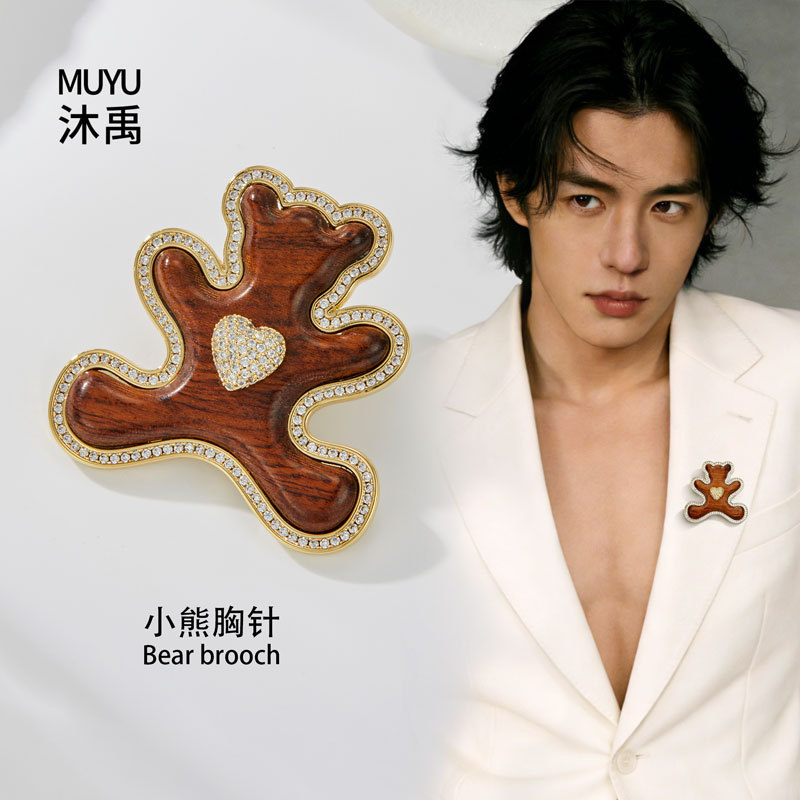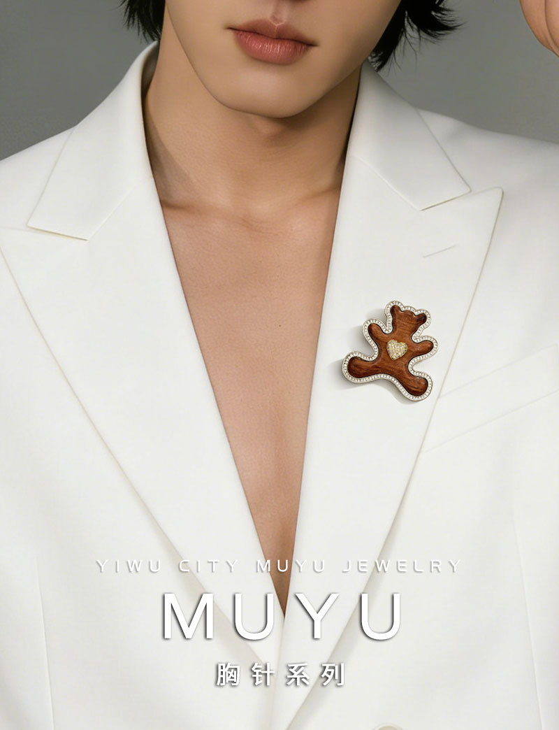 原创高级感木质小熊胸针萌趣可爱铜合金微镶锆石真金电镀精致别针