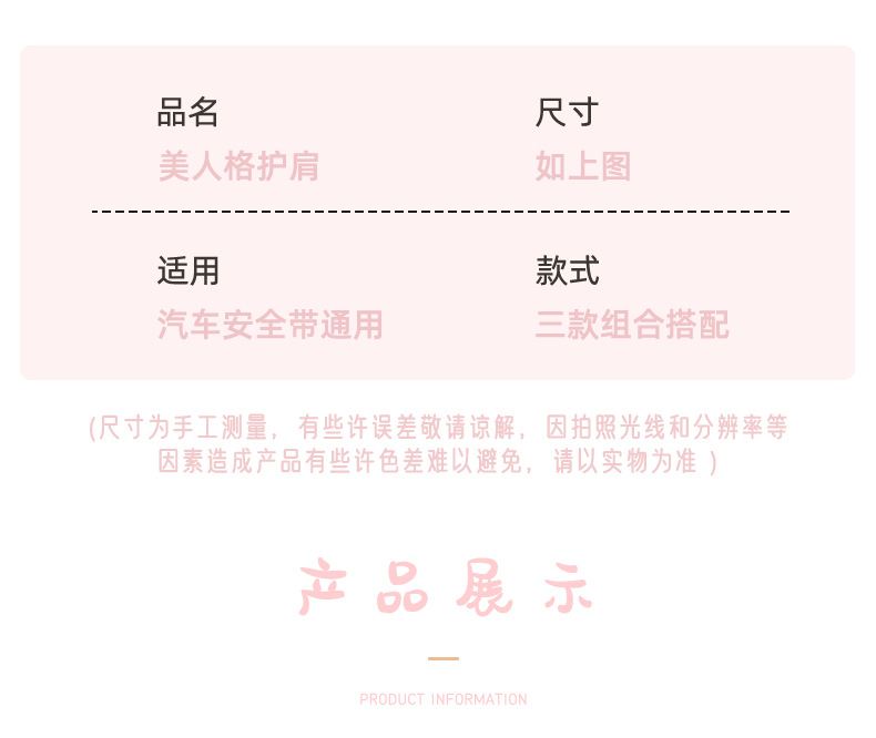 品牌: 蓝雨(车载用品) 材质: 毛绒 种类: 实用 重量: 100g 配件类型: 护肩套 产地: 浙江 加工定制: 是 颜色: 美人格护肩粉色,美人格护肩白色,美人格护 适用送礼场合: 婚庆,生日,展销会,广告促销,员工福利, 加印LOGO: 可以 货号: 美人格护肩 主要下游平台: ebay,亚马逊,wish,速卖通,独立 主要销售地区: 非洲,欧洲,南美,东南亚,北美,东北亚, 有可授权的自有品牌: 是 是否跨境出口专供货源: 是 重量: 0.1 kg/个