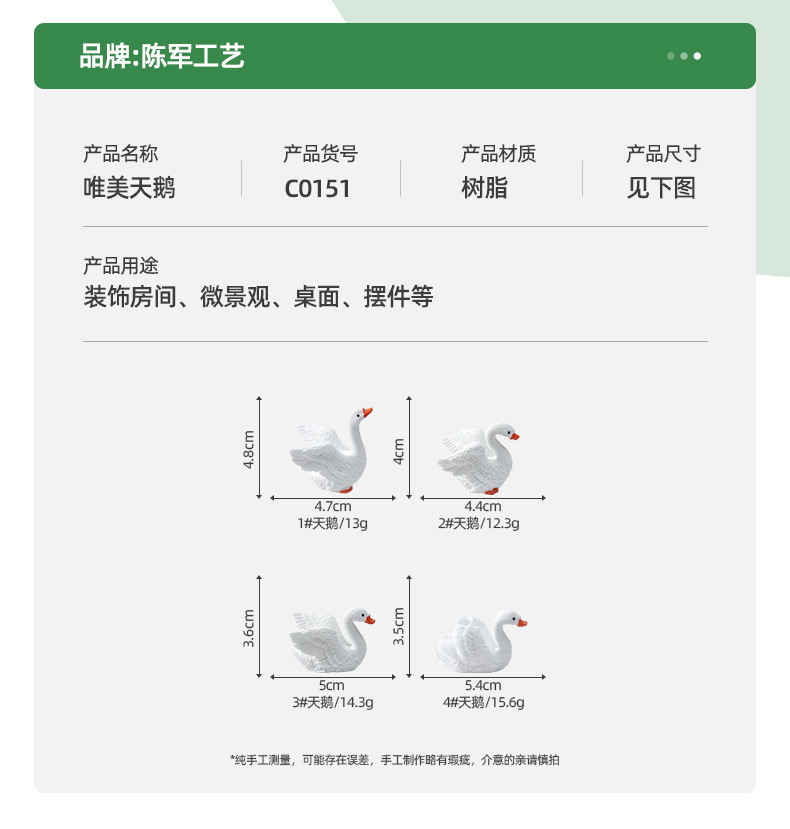 材质: 树脂 类别: 树脂工艺品 风格: 卡通 品牌: 陈军工艺 包装: 普通包装 适用节日: 通用 货号: C0151 是否专利货源: 否 颜色: 唯美天鹅1号,唯美天鹅2号,唯美天鹅3号 适用送礼场合: 其他