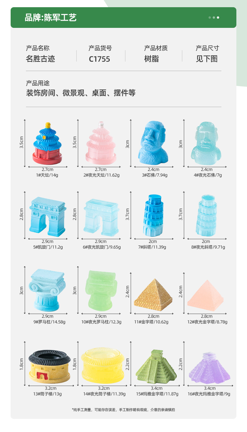 材质: 树脂 类别: 树脂工艺品 风格: 卡通 品牌: 陈军工艺 包装: 普通包装 适用节日: 通用 货号: C1755 是否专利货源: 否 颜色: 1#祈年殿,2#夜光祈年殿,5#凯旋门, 尺寸: 名胜古迹16款