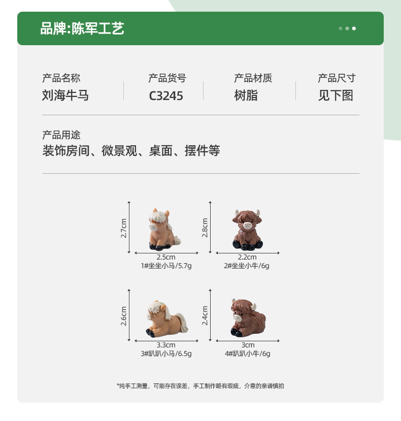 材质: 树脂 类别: 树脂工艺品 风格: 卡通 品牌: 陈军工艺 包装: 普通包装 货号: C3245 是否专利货源: 否 颜色: 1#坐坐小马,2#坐坐小牛,3#趴趴小马 尺寸: 刘海牛马 是否属于礼品: 否