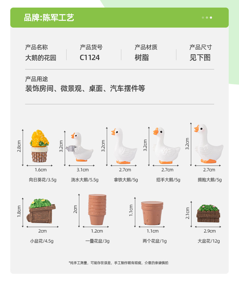 材质: 树脂 类别: 动物 风格: 田园 品牌: 陈军工艺 包装: 普通包装 货号: C1124 是否专利货源: 否 颜色: 拿铁铲大鹅,一叠花盆,两个花盆 是否属于礼品: 否 是否IP授权: 否