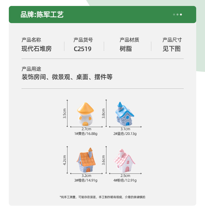 材质: 树脂 类别: 树脂工艺品 风格: 卡通 品牌: 陈军工艺 包装: 普通包装 货号: C2519 是否专利货源: 否 颜色: 1#黄色,2#蓝色,3#橙色,4#粉色 尺寸: 现代石堆房 是否属于礼品: 否