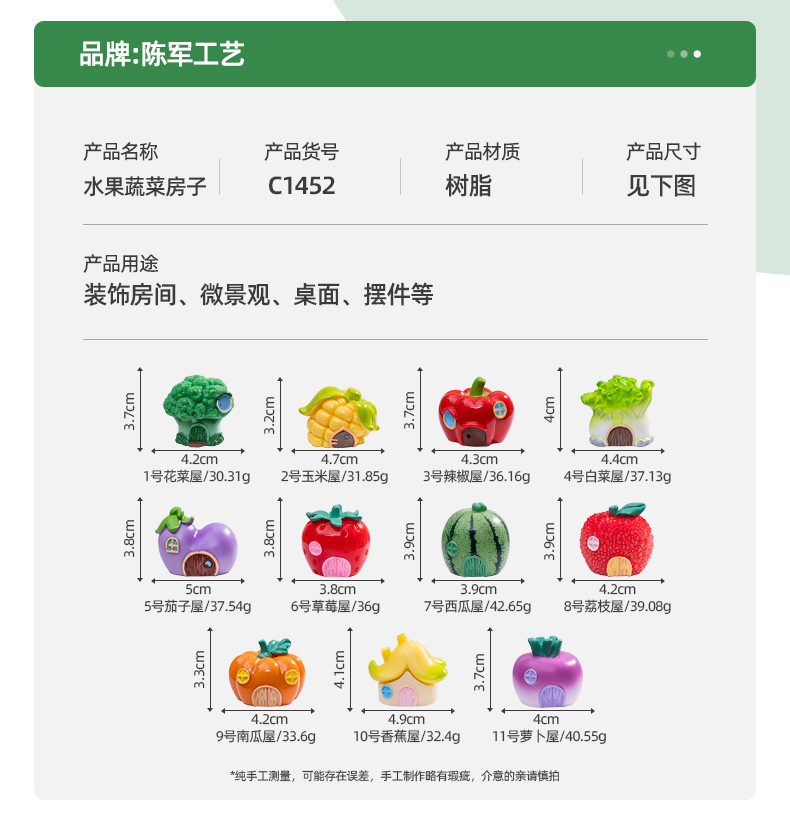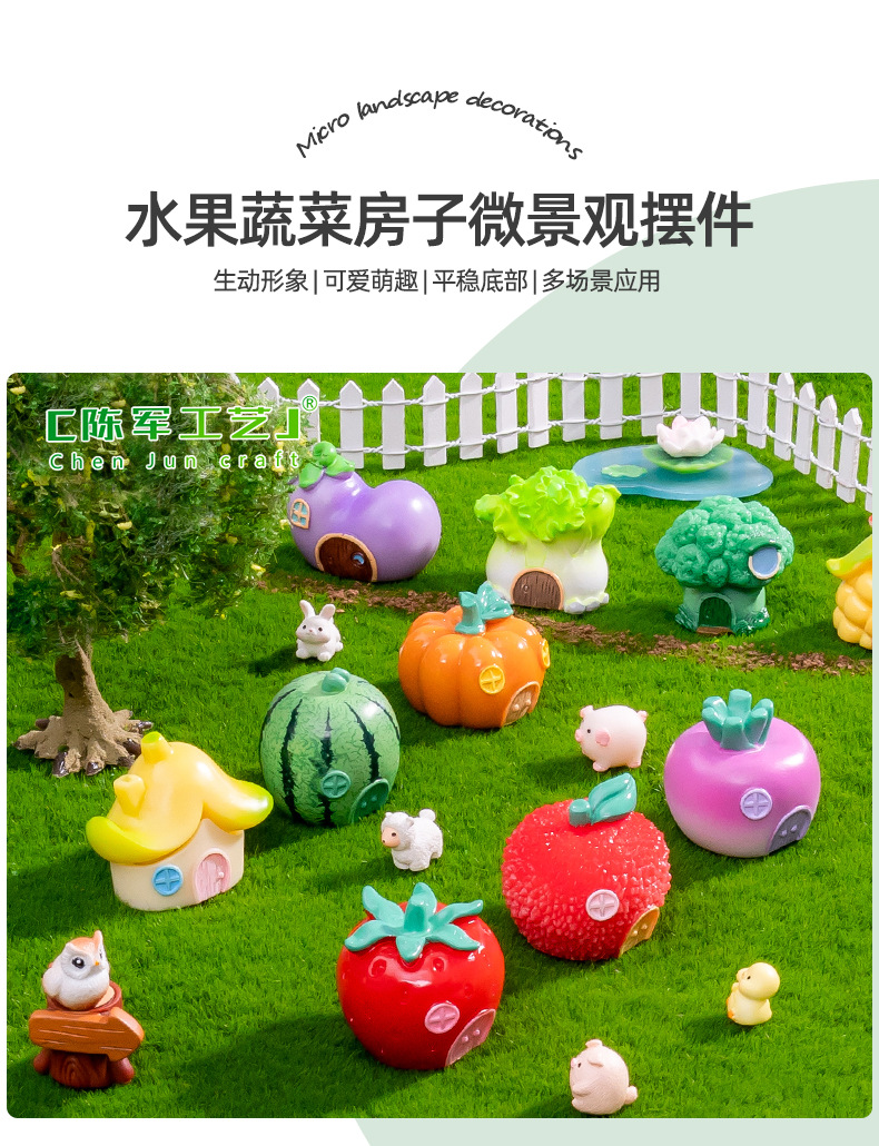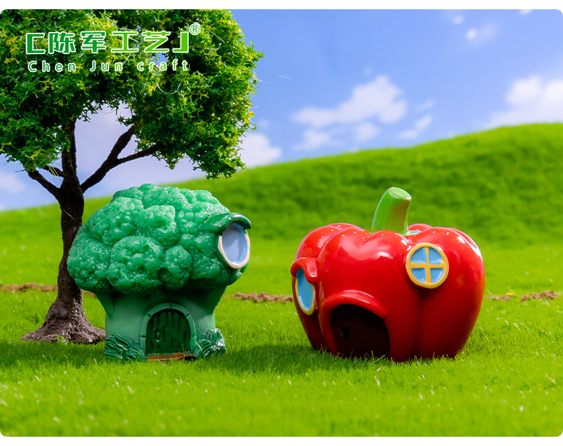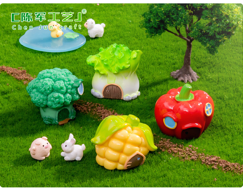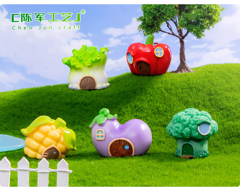 材质: 树脂 类别: 树脂工艺品 风格: 卡通 品牌: 陈军工艺 包装: 普通包装 适用节日: 通用 货号: C1452/C1387 是否专利货源: 否 颜色: 1号花菜屋,2号玉米屋,3号辣椒屋,4号 尺寸: 水果蔬菜房子11款